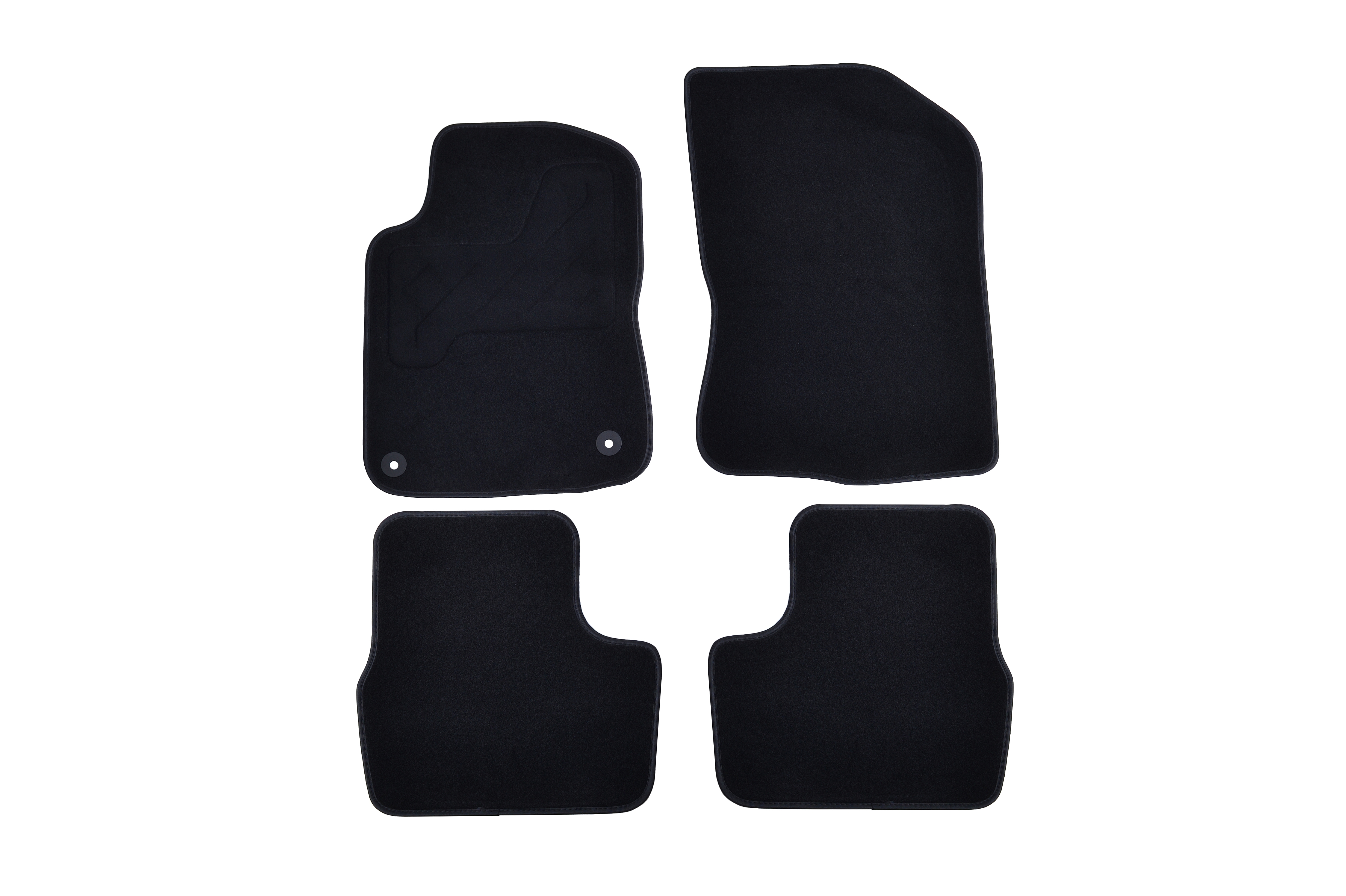 Moquette aiguilletée 750 g/m² - talonnette renforcée et ganse textile - Mousse antidérapante côté conducteur - dos granulé côté passager et à l'arrière - clips de fixation d'origine