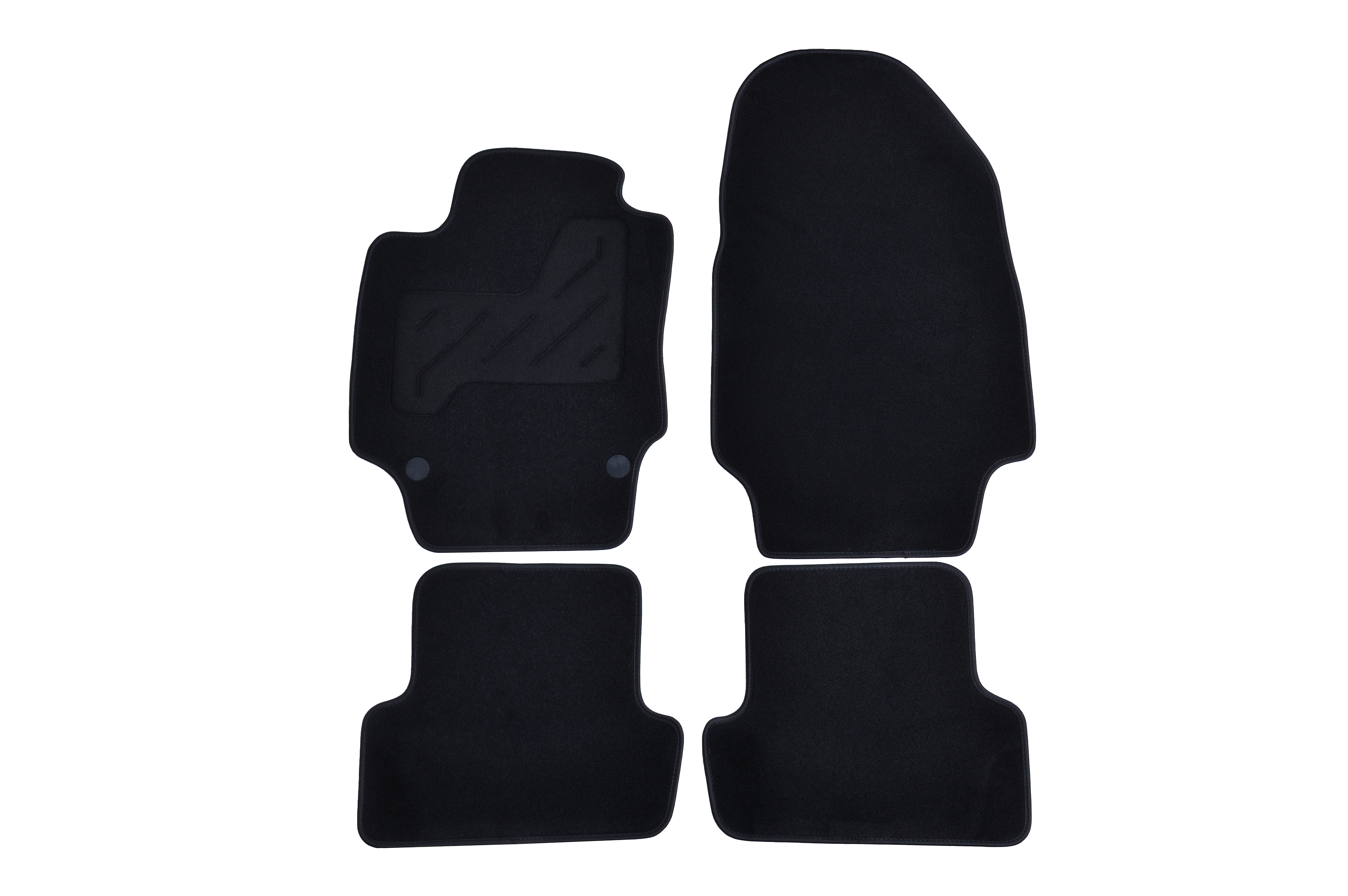 Moquette aiguilletée 750 g/m²- talonnette renforcée et ganse textile - mousse antidérapante côté conducteur - dos granulé côté passager et à l'arrière - clips de fixation d'origine