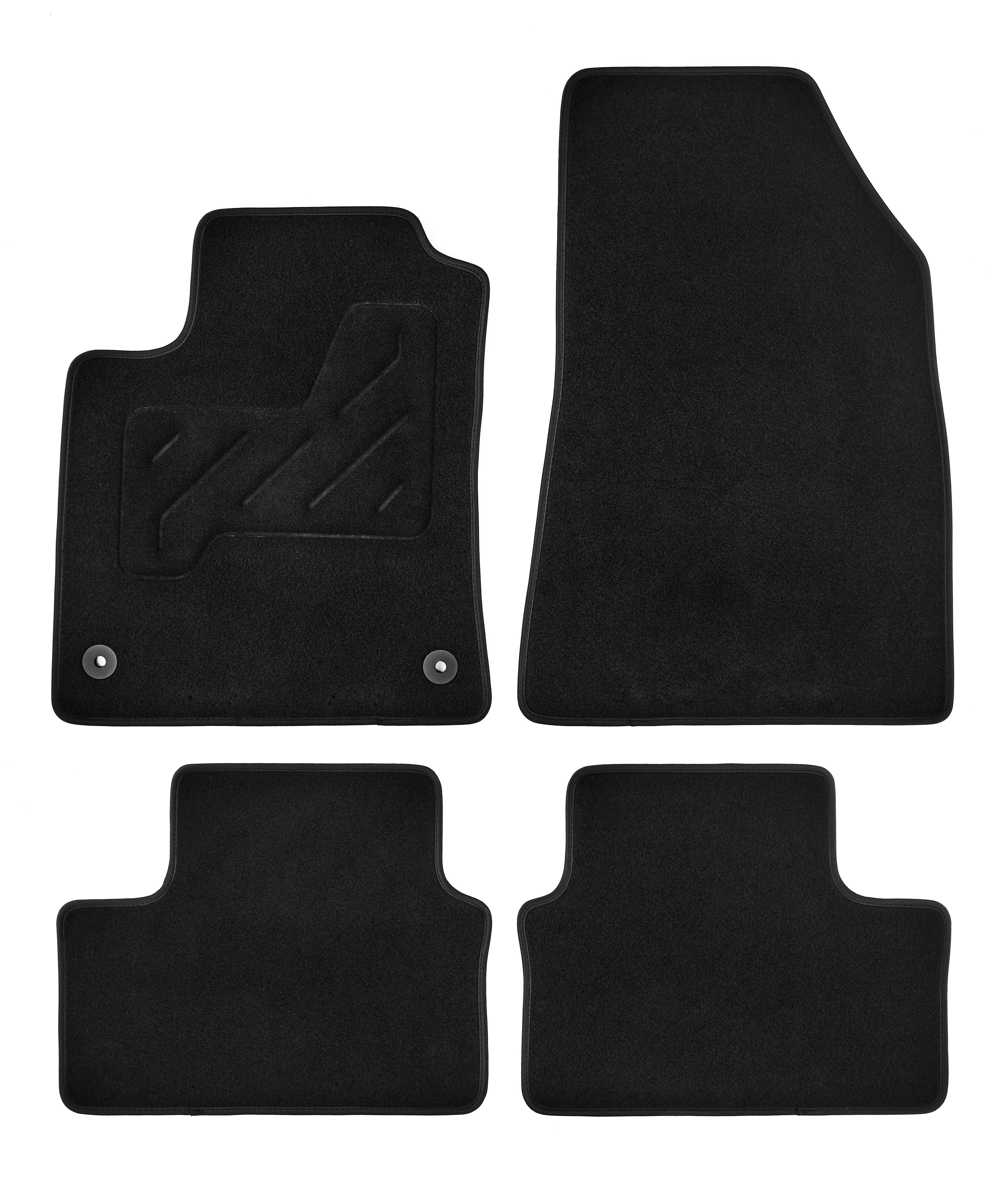Moquette aiguilletée 750 g/m² - talonnette renforcée et ganse textile - mousse antidérapante côté conducteur - dos granulé côté passager et à l'arrière - clips de fixation d'origine