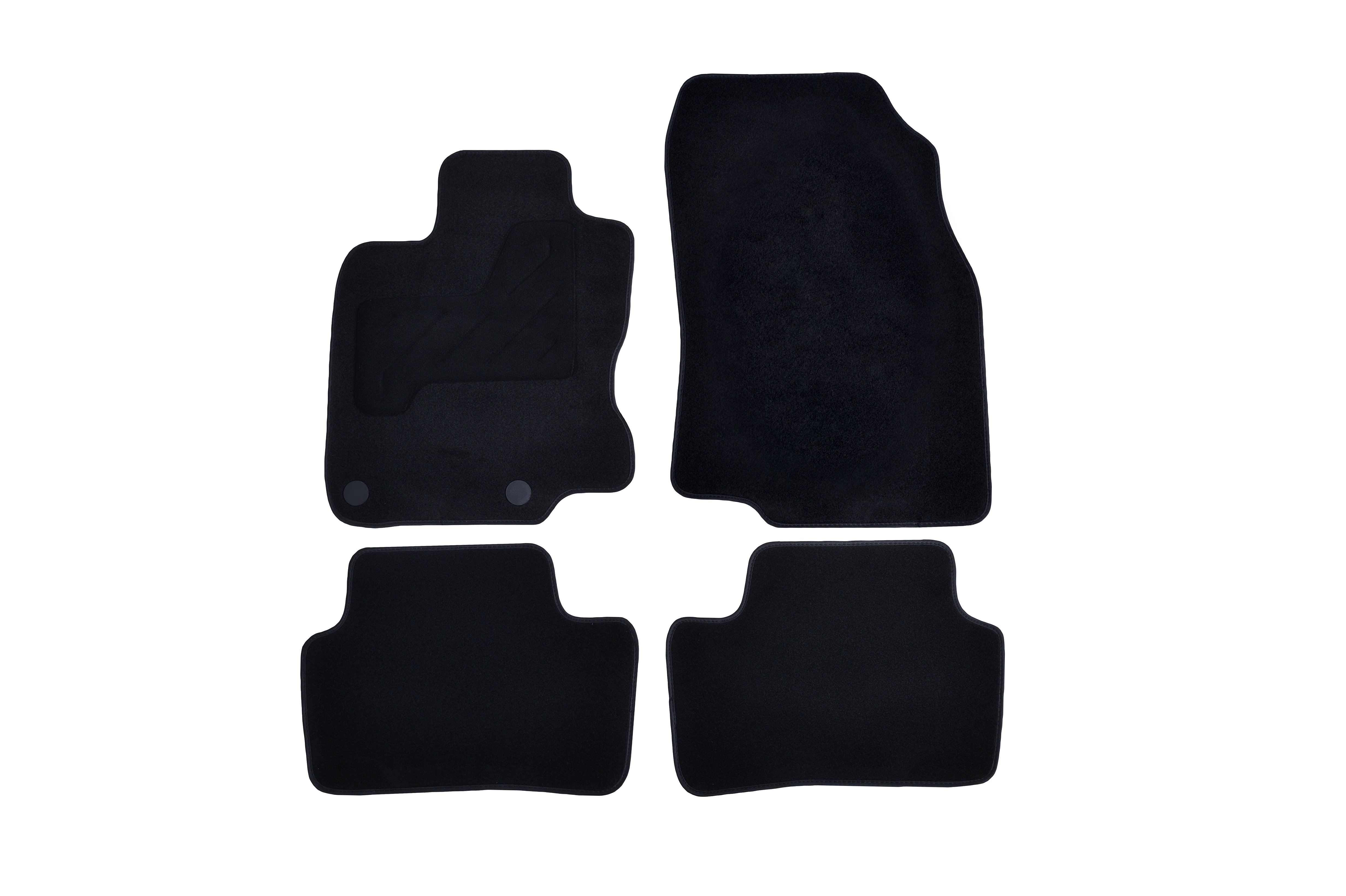 Moquette aiguilletée 750 g/m² - talonnette renforcée et ganse textile - mousse antidérapante côté conducteur - dos granulé côté passager et à l'arrière - clips de fixation d'origine