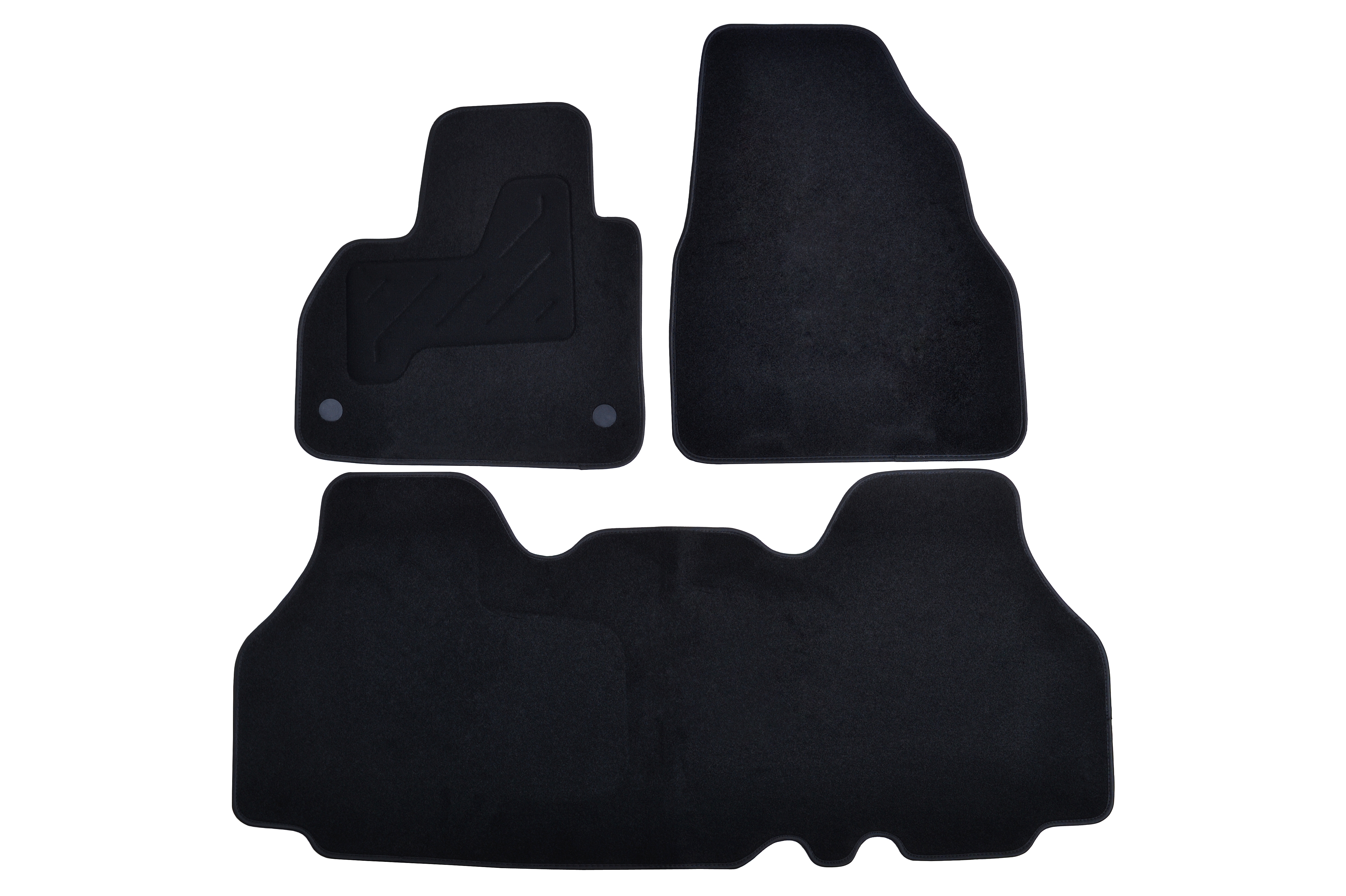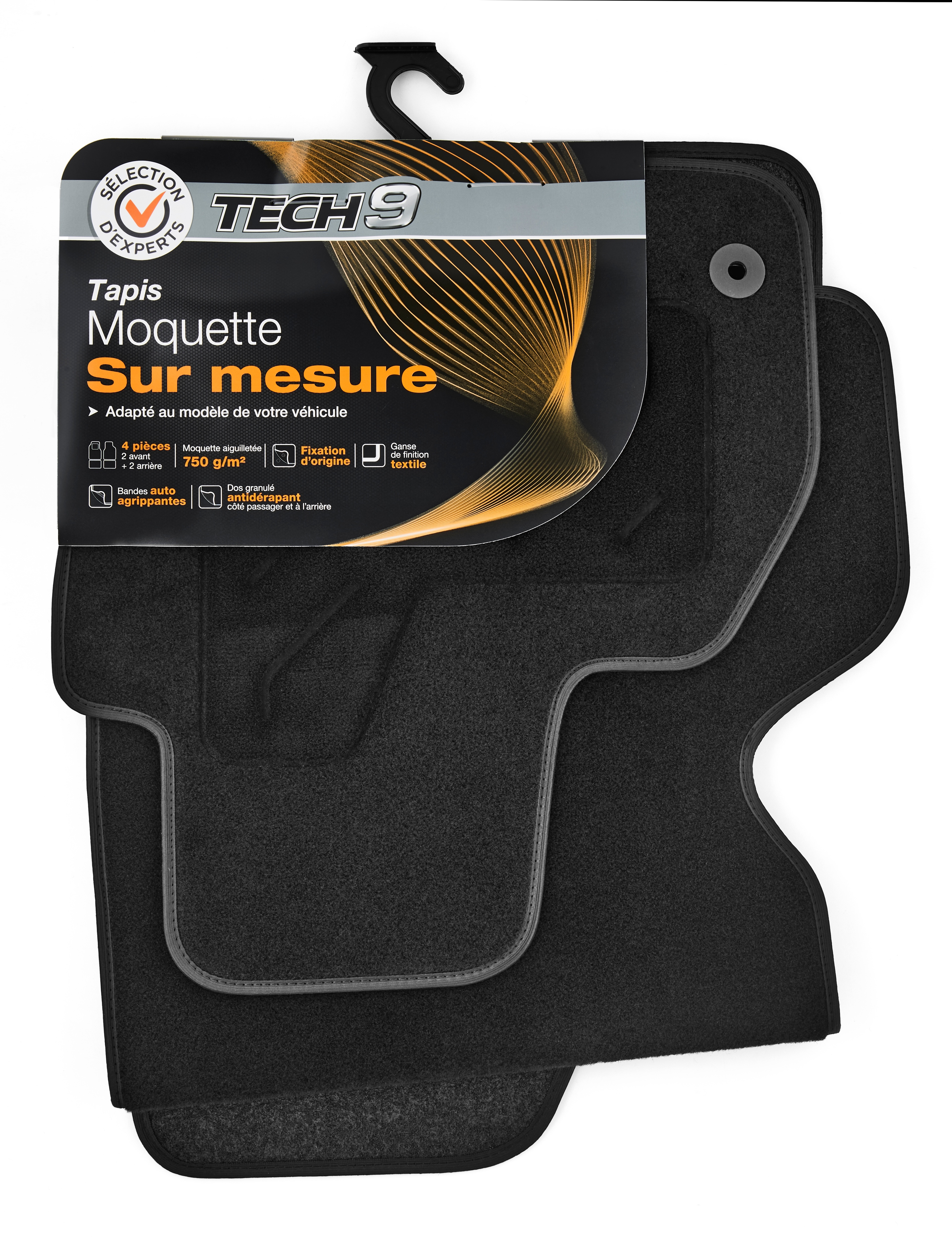 Moquette aiguilletée 750 g/m² - talonnette renforcée et ganse textile - mousse antidérapante côté conducteur - dos granulé côté passager et à l'arrière - clips de fixation d'origine