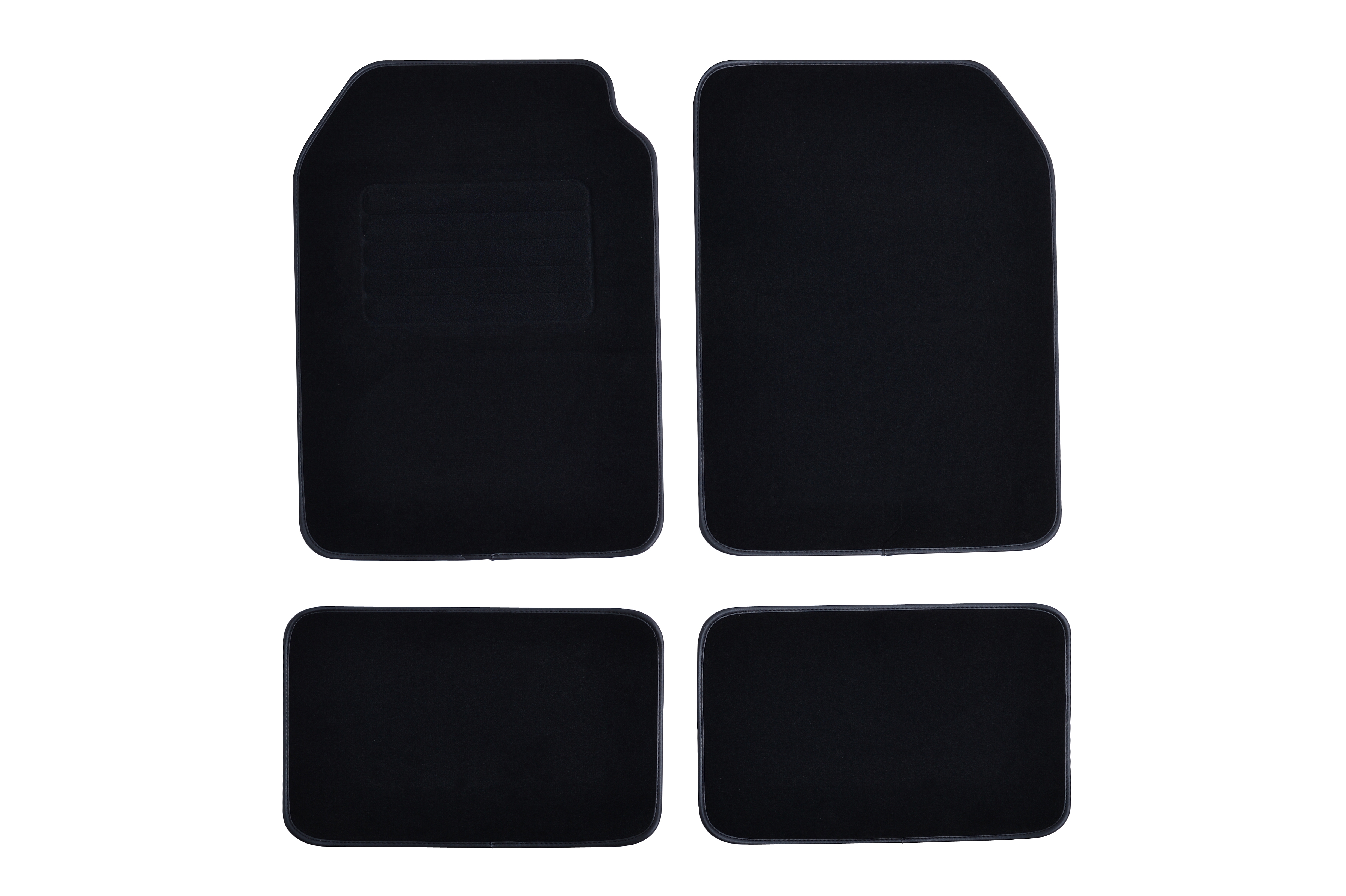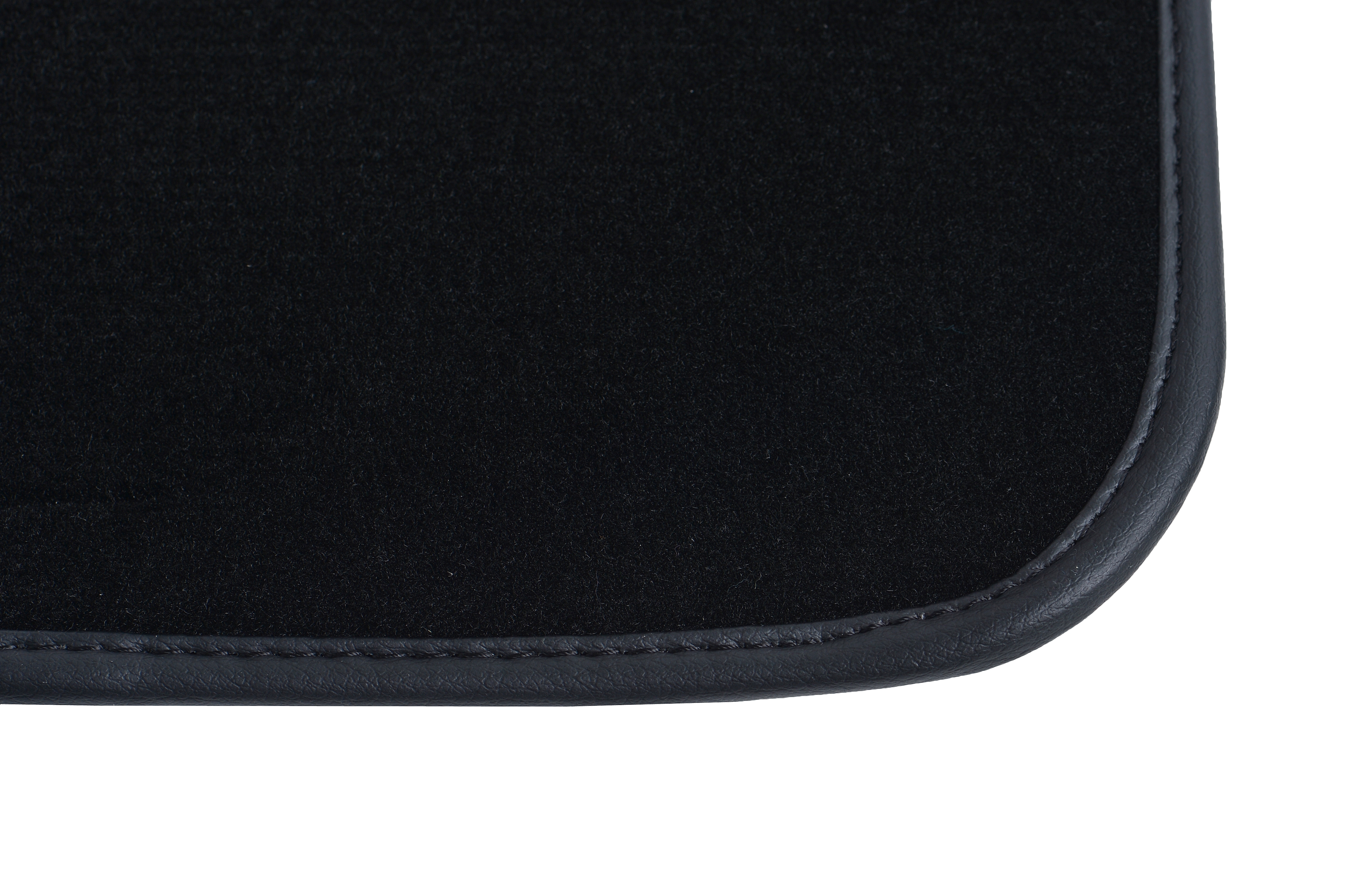 Moquette haute densité "velours" 750 g/m² - talonnette renforcée et ganse simili cuir - mousse antidérapante côté conducteur - dos granulé côté passager et à l'arrière