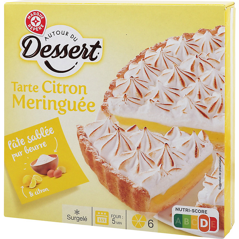 TARTE À BASE DE PÂTE SABLÉE (31,8 %) RECOUVERTE D'UNE GARNITURE AU CITRON (41,8 %) ET D'UNE MERINGUE (26,4 %), CUITE, SURGELÉE COTE TABLE DESSERT