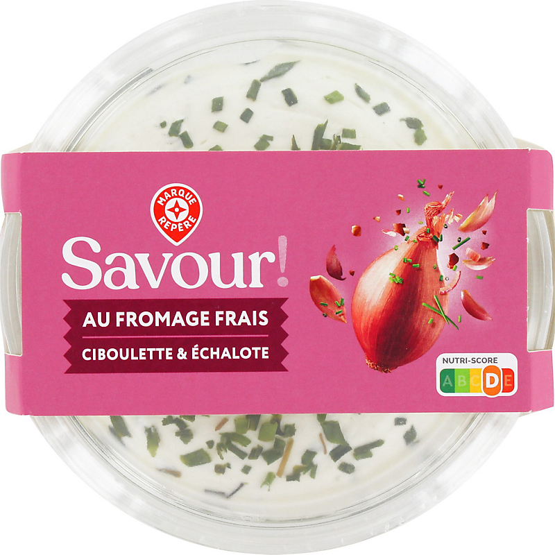 Ingrédients : Fromage frais à 32 % de matières grasses 70 %, fromage frais à 0 % de matières grasses 23 %, ciboulette 2,3 %, échalote 2,3 %, fibres de blé, jus de citron concentré, conservateur : E202, épaississant : gomme xanthane, ciboulette déshydratée 0,07%, amidon de manioc.