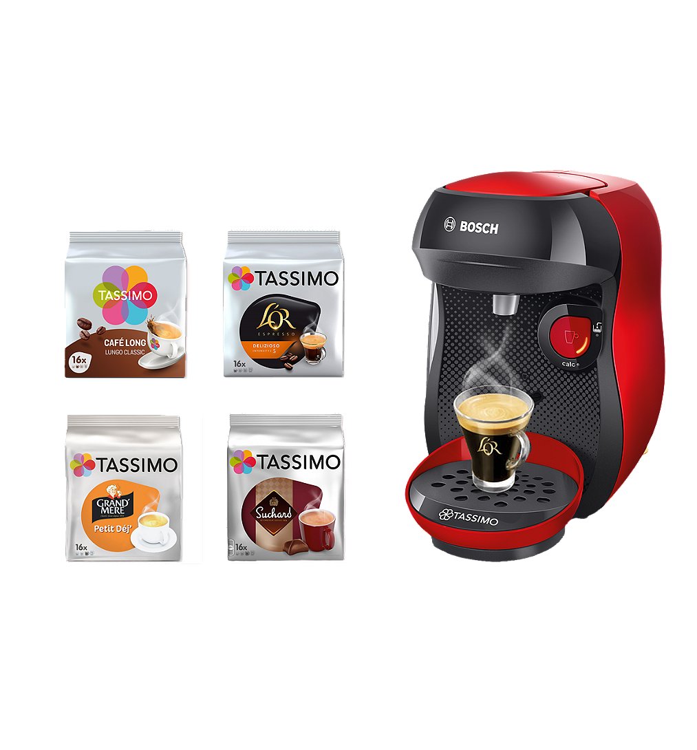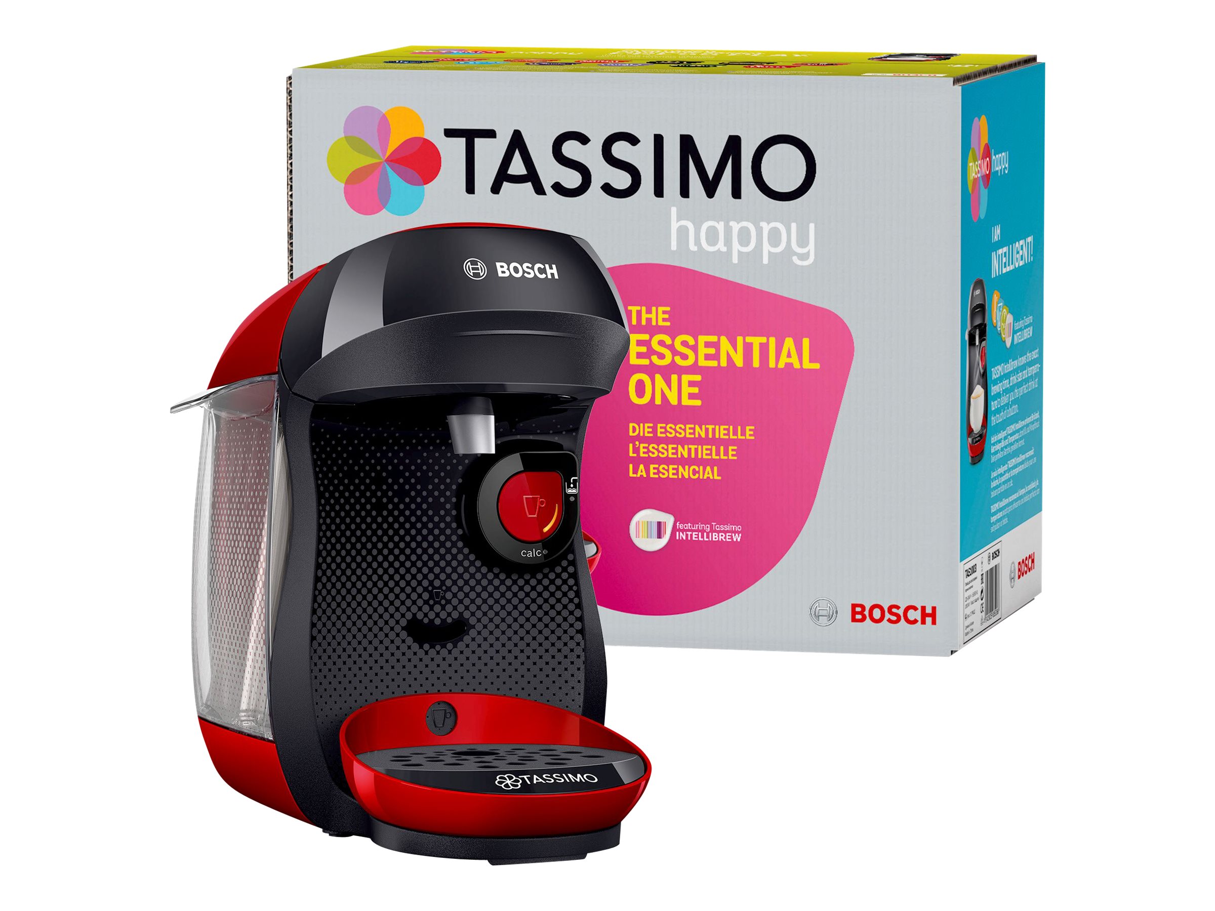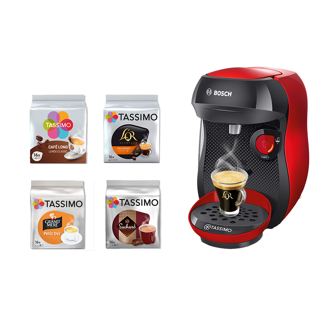 Haute comme 3 pommes avec un design épuré, la machine à café TASSIMO HAPPY trouve facilement sa place dans toutes les cuisines, même les plus minis ! TASSIMO HAPPY est une petite cafetière à capsules, conçu par Bosch. Cette TASSIMO machine à café offre plus que juste du café. Utilisez votre TASSIMO capsules préférées pour préparer toutes les boissons chaudes que vous aimez. Tous les TASSIMO T DISCs sont compatible avec TASSIMO HAPPY. Réservoir pratique de 0.7L Un choix unique de préparation de plus de 40 boissons Une préparation immédiate, sans temps d'attente Très facile d’utilisation: interface tactile Puissance : 1300 Watts Réservoir d'eau : 0,7L