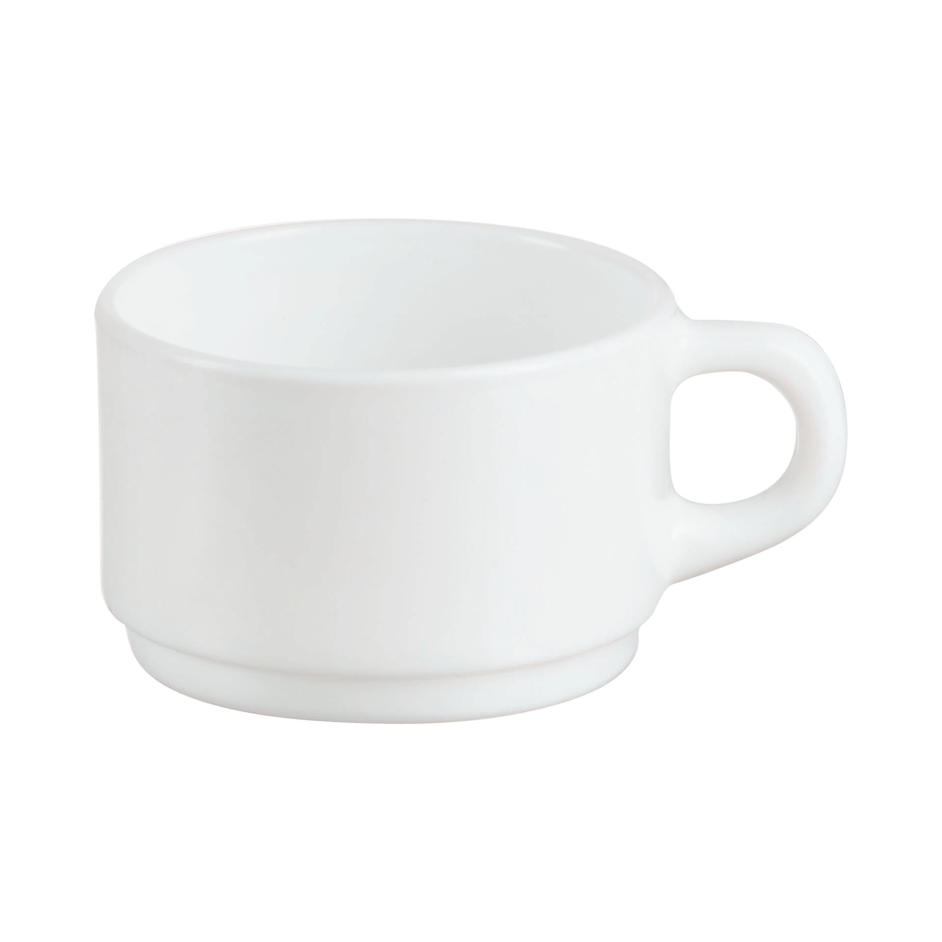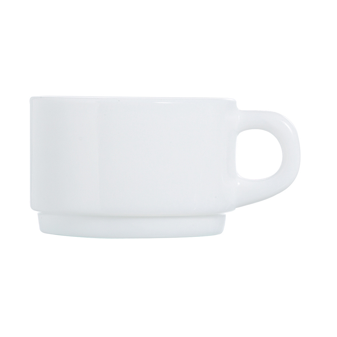 Tasse en verre empilable blanche.