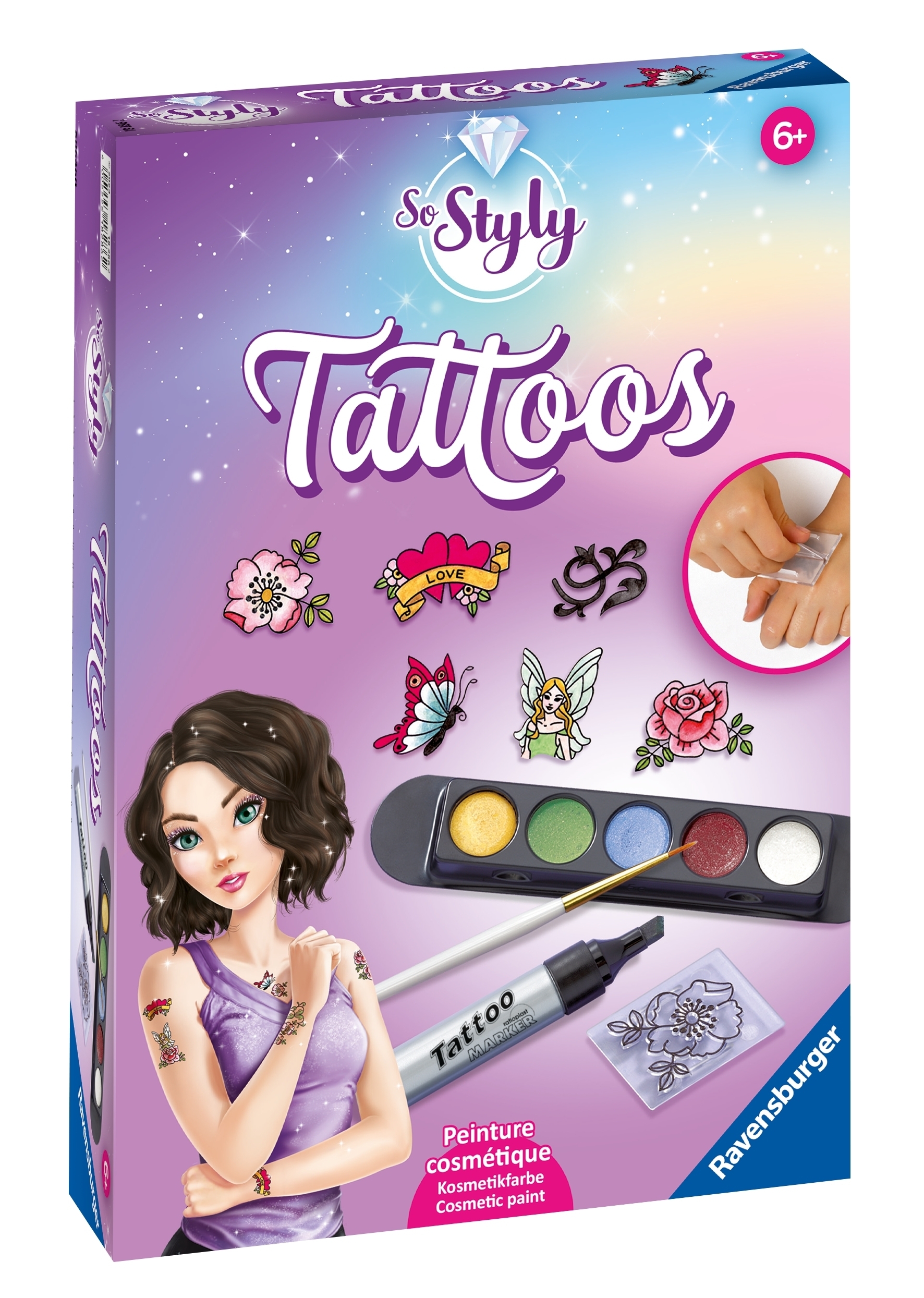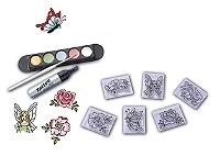 Un coffret très tendance pour réaliser ses propres tatouages et les décorer soi-même à laide de peintures cosmétiques professionnelles. Tout le nécessaire est réuni pour inventer son look. Grâce aux 6 tampons, cest facile de réaliser son dessin et de le peindre avec les 5 couleurs de peintures cosmétiques. Idéal pour allier le plaisir de créer à celui de se faire belle entre copines ! A partir de 6 ans. Ce produit est composé de matériaux issus de forêts bien gérées certifiées FSC®, de matériaux recyclés et de matériaux issus dautres sources contrôlées (FSC-C111262).