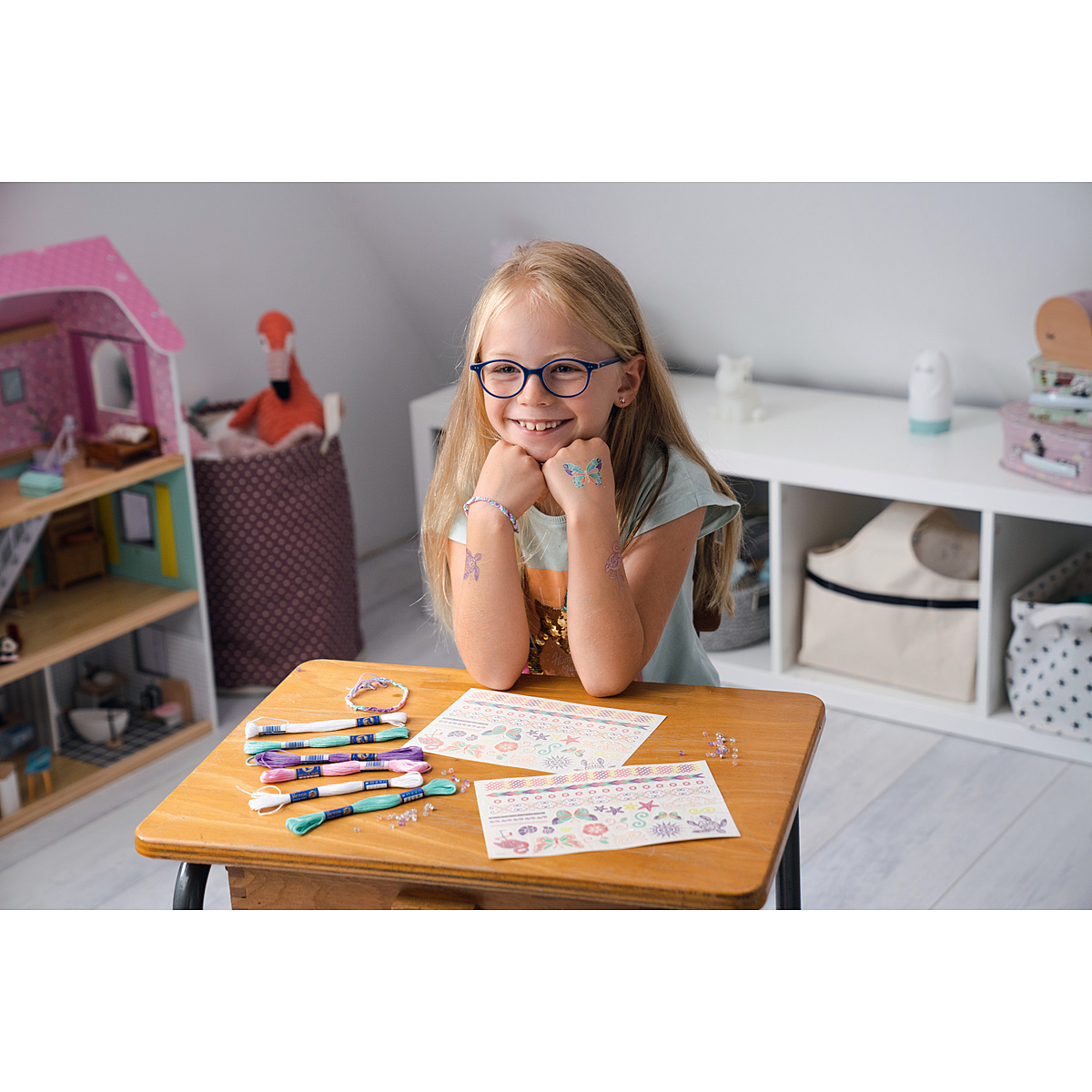 Plus produit CRÉE TES TATOUAGES ET BRACELETS BRÉSILIENS Retrouve en 1 seul coffret 2 activités créatives et tendances. Réalise tes propres tatouages éphémères et assortis-les avec tes bracelets brésiliens, à porter aux poignées ou aux chevilles. Dès 8 ans. SIMPLE POUR RÉALISER LES TATOUAGES Fais ton choix parmi les 50 tatouages tendances et colorés.Tatoue-toi de papillons, flamants roses, étoiles, fleurs et plus encore grâce aux 2 planches incluses. Découpe le motif, mouille-le sur ta peau avec une éponge quelques secondes et le tour est joué ! PRATIQUE POUR RÉALISER LES BRACELETS Le support de création permet de fixer ton bracelet grâce à une épingle à nourrice incluse pour réaliser ton bijou avec stabilité. La règle, intégrée à ton support, permet de savoir à quel moment tu peux arrêter de tisser suivant la taille de bracelet que tu souhaites. FAVORISE CONCENTRATION ET AUTONOMIE Loin des écrans, cette activité créative allie dextérité et précision pour développer l\'habilité manuelle des enfants. C\'est une activité idéale à faire avec tes proches. Une fois finis, porte tes bracelets ou offre-les à tes proches comme bracelets d\'amitié ! TOUT EST INCLUS 1 support pour créer les bracelets avec règle incluse, 1 épingle à nourrice pour accrocher ton bracelet au support, 48 m de fil de 4 couleurs, 200 perles transparantes satinées de 5 couleurs, 50 tatouages et 1 notice détaillée.
