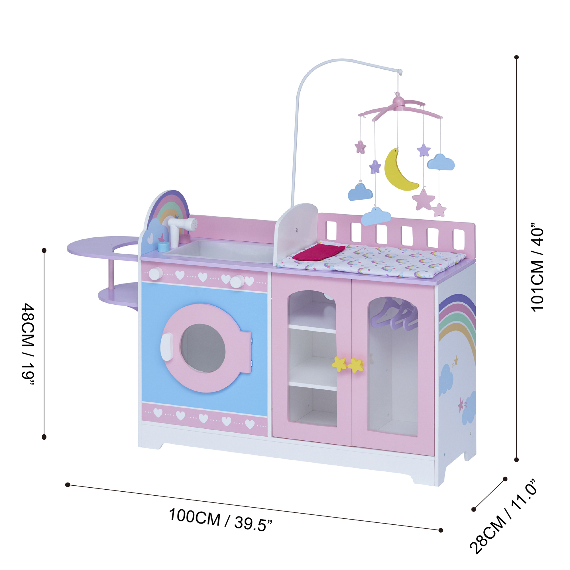 Améliorez l'aire de jeu de votre tout-petit avec la table à langer 6 en 1 Olivia's Little World par Teamson Kids. Cette station à langer multifonctionnelle pour poupon présente des finitions rose vif et violet avec des accents blancs, ce qui la rend idéale pour un rôle interactif. Tout cela -le poste à langer pour chambre d'enfant comprend un espace à langer avec literie et mobile, un évier pour le bain, une chaise haute pour le repas et une machine à laver « jouer » pour stimuler l'imagination de votre tout-petit. Les deux armoires intégrées avec étagères et un espace de rangement ainsi que trois cintres permettent de ranger les vêtements de poupée, les couches, les jouets et autres accessoires. Les fonctions interactives incluent les portes ouvertes/fermées, le robinet tournant et la machine à laver comme cadrans tournants et le « robinet de douche » mobile. Facile à nettoyer et à assembler, c'est un must pour n'importe quelle salle de jeux, salle de classe ou crèche