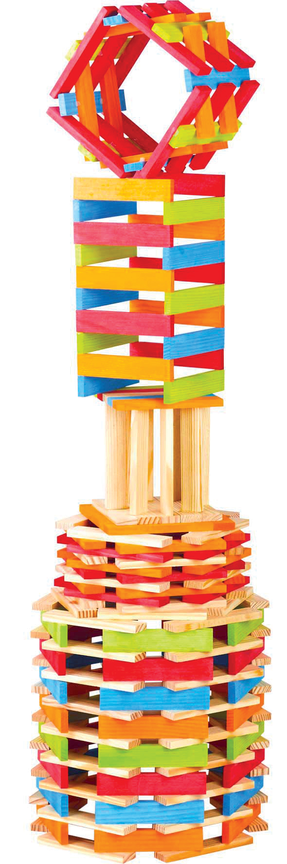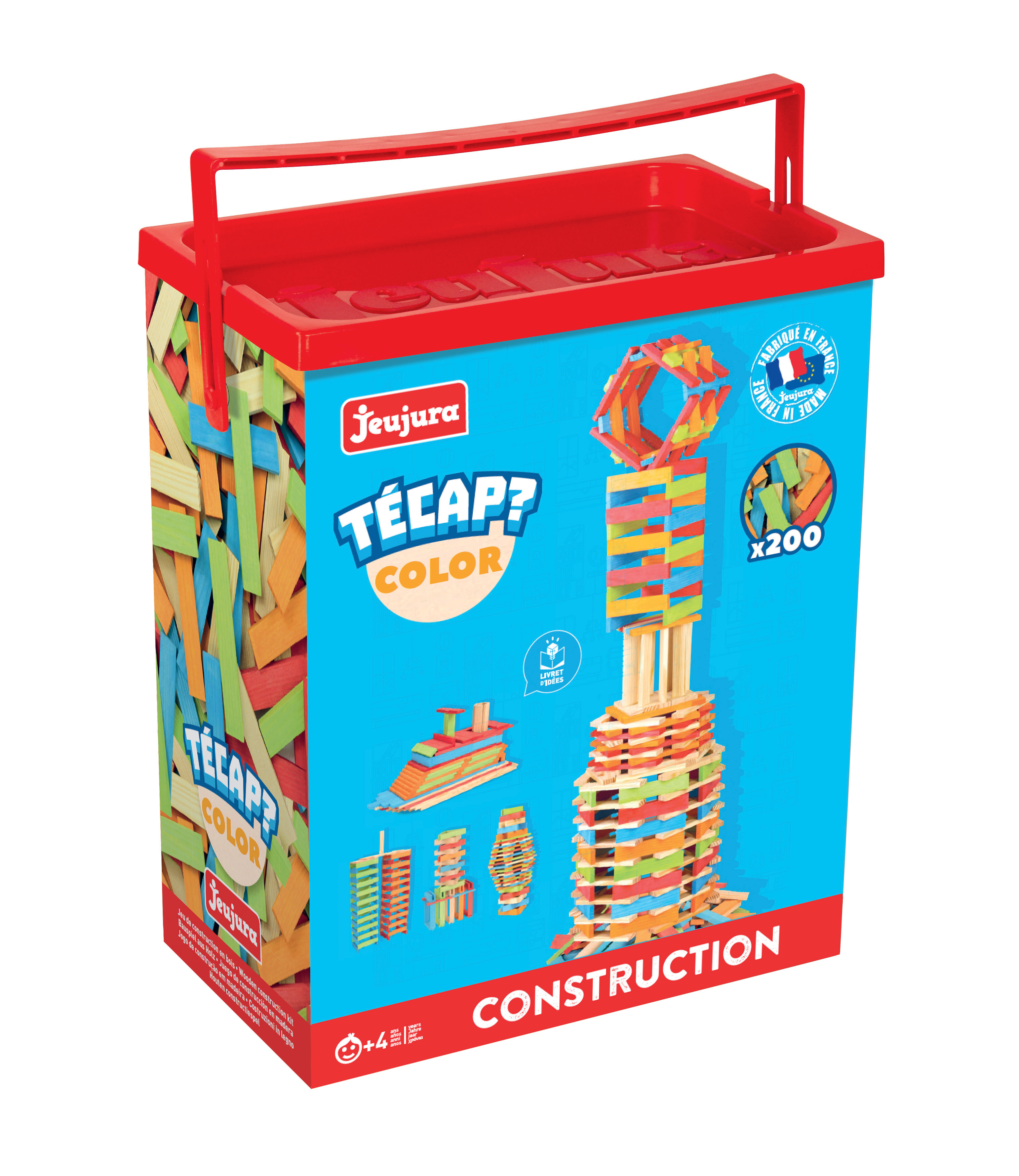 Técap ? Color - 200 pièces : jeu d'équilibre et de construction en bois naturel et teinté, des planchettes colorées pour multiplier les combinaisons et réaliser de nombreuses constructions tout en couleur. Baril en carton : 27 x 33 x 15 cm - A partir de 4 ans