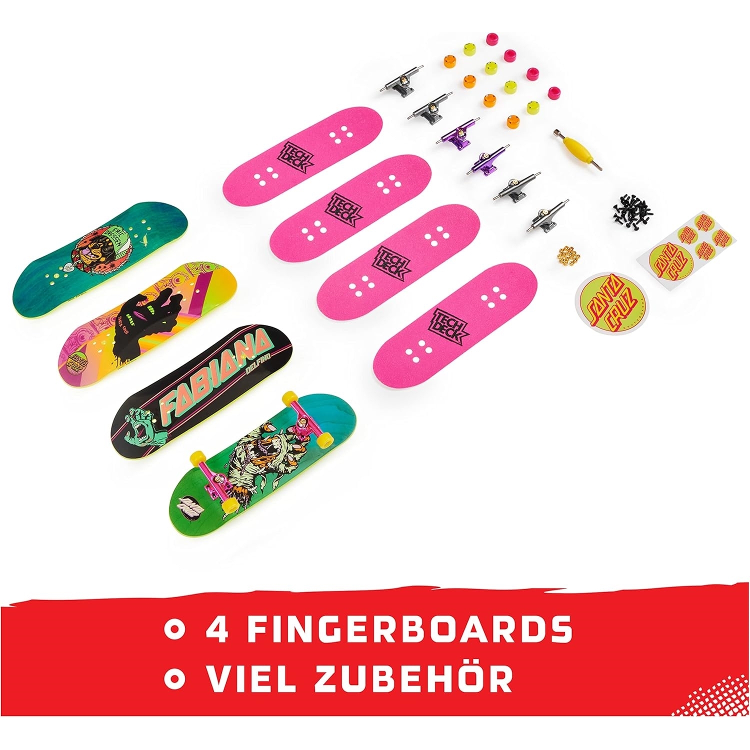 Spin Master 6028815 Tech Deck - Ultra DLX Lot de 4 - - Le pack Tech Deck Ultra DLX contient 4 fingerboards avec des graphismes authentiques des plus grandes marques de skateboard.Entièrement transformable - comme le grand skateboard : sur les 4 fingerboards, les decks, les axes et les roulettes peuvent être échangés - pour un design personnalisé. - - Uniquement des graphismes originaux : Ces decks sont absolument authentiques. Les cascades comme les rides, les flips et les grinds sont deux fois plus amusantes. - - Détails : - - Contenu : Ultra DLX 4-pack - 1 planche assemblée, 3 planches avec griptape et les accessoires correspondants. - À partir de : 6 ans