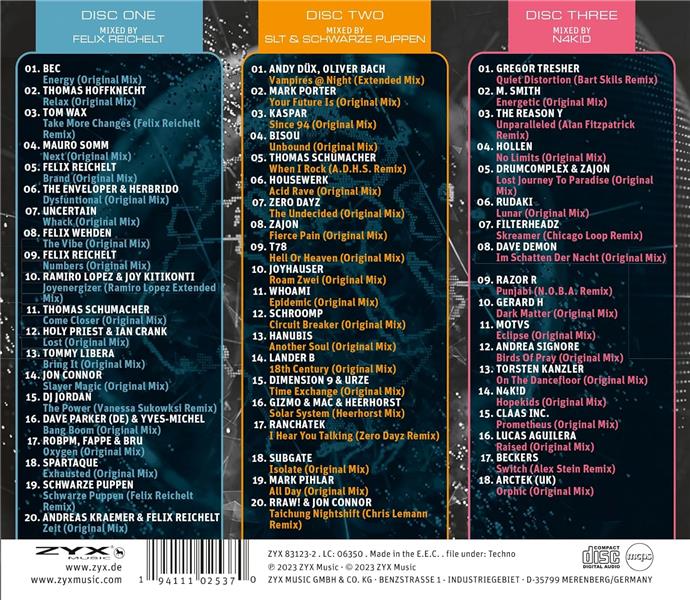 La techno est actuellement très en vogue dans le monde de la musique électronique. Nous vous présentons le son techno actuel, rassemblé et mixé par Felix Reichelt, SLT & Andreas Kraemer et N4K!D dans un coffret de 3 CD. Avec des morceaux et des remixes de Thomas Schumacher, A.D.H.S., Joyhauser, T78, Torsten Kanzler, MOTVS, DJ Jordan, Spartaque, Extrawelt, Mark Porter, Thomas Hoffknecht, Lander B, Filterheadz, Jon Connor, RSRRCT, Schroomp, Tommy Libera, Uncertain, Dimension 9/URZE, Felix Wehden, The Enveloper & Herbrido et bien d'autres ! En outre, la compilation permet de découvrir de nouveaux talents et de nouveaux morceaux frais qui donnent envie d'en écouter plus. Si vous voulez faire la fête sur la techno actuelle, il vous faut absolument avoir ce coffret !