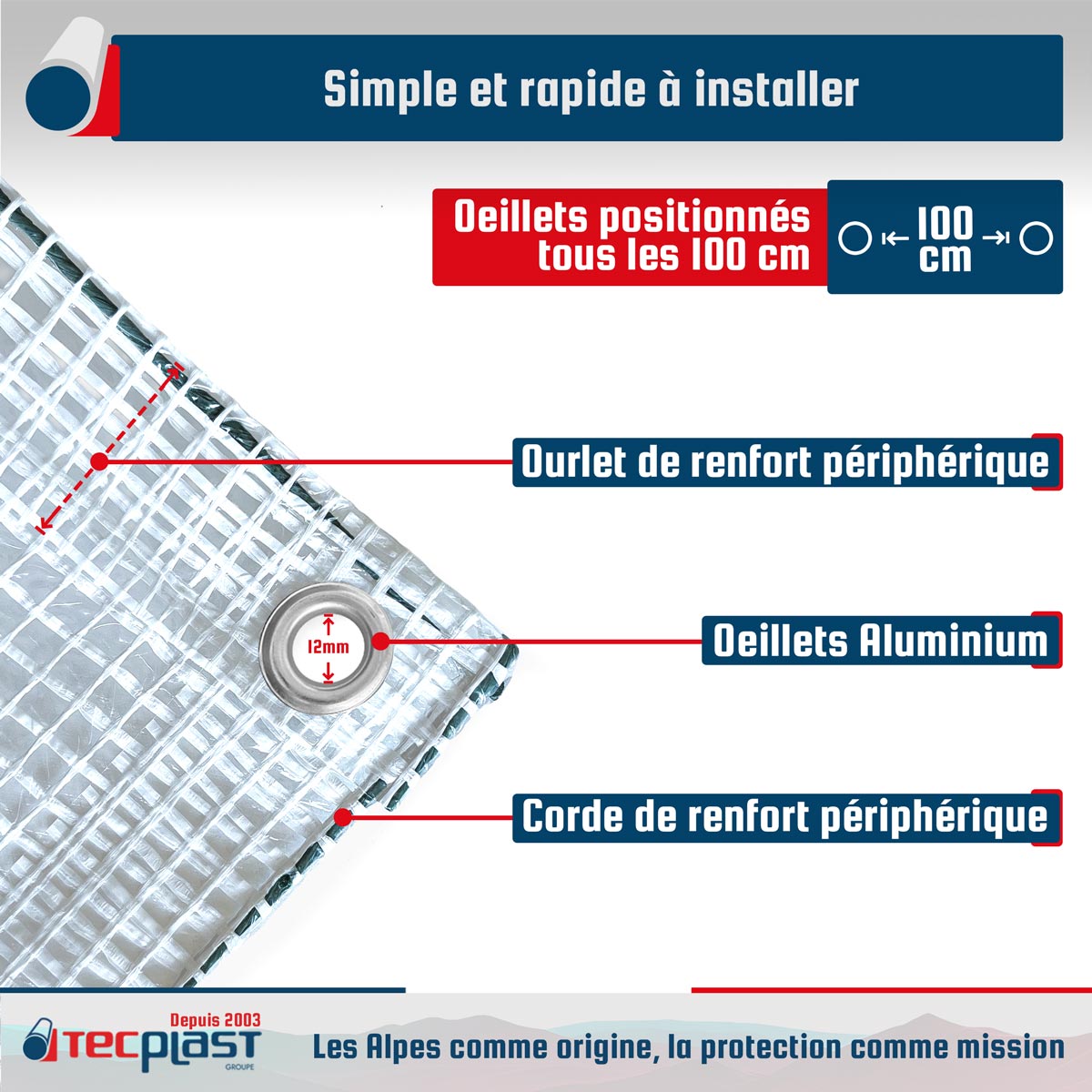 • Facile à installer grâce à son ourlet périphérique et surtout ses œillets aluminium espacés d'un mètre.