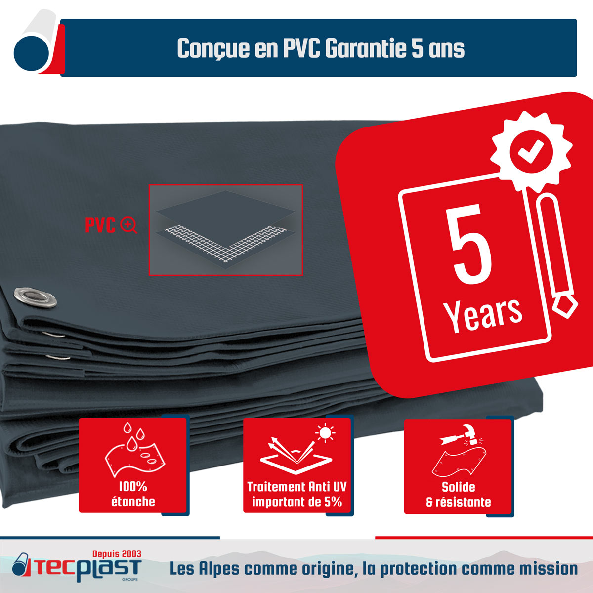 TECPLAST Bâche Toiture 8x12 m LP506TO Gris anthracite - Garantie 5 ans - Bâche d'étanchéité en PVC pour C