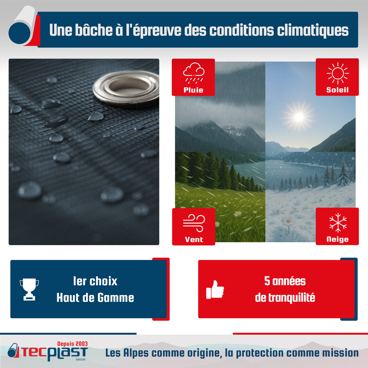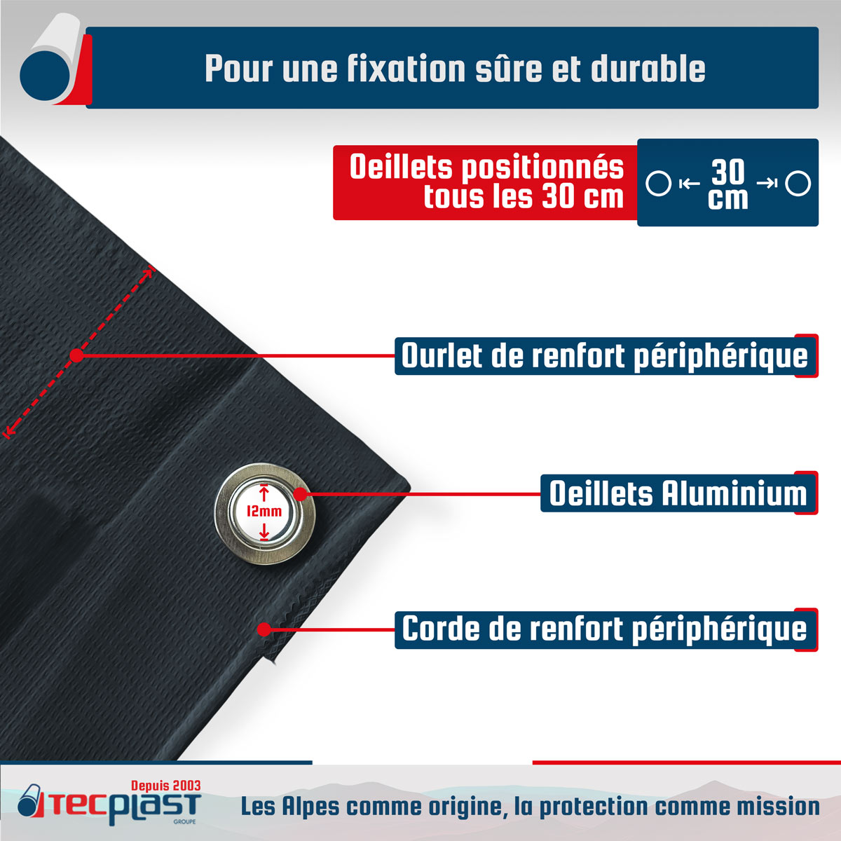 GARANTIE COMMERCIALE TECPLAST - Votre entière satisfaction est une priorité absolue pour TECPLAST. Pour preuve, elle vous fait bénéficier d'une garantie commerciale TECPLAST de 5 ans sur ce produit. Fabriqué avec des matériaux de haute qualité, il vous offrira une tranquillité d'esprit inégalée et participera à la réduction des déchets étant un produit durable dans le temps. La prise en charge est simple et rapide sous réserve d'acceptation par la marque. Veuillez noter que les conditions et usages ci-après n'ouvrent pas le droit à cette garantie. Conditions Météorologiques Extrêmes (vent, grêle, neige...) - Montage et Fixation Inadaptés (prise au vent trop importante, pente insuffisante, mauvaise tension...) - Mauvaise Utilisation (déchirures causées par des objets coupants, brûlures, modifications de la bâche, détournement de l'utilisation normale, destruction par négligence ou volontaire...) - Défaut d'apparence ne nuisant pas aux aspects fonctionnels (décolorations, tâches, mousses, rouille...).| Libellé | TECPLAST Bâche Toiture 8x12 m LP506TO Gris anthracite - Garantie 5 ans - Bâche d'étanchéité en PVC pour Couvreur et Charpentier |