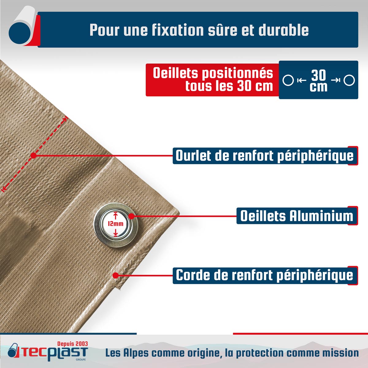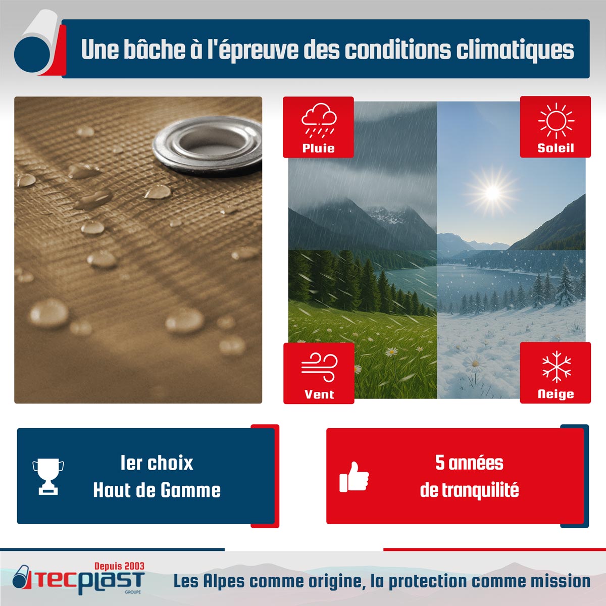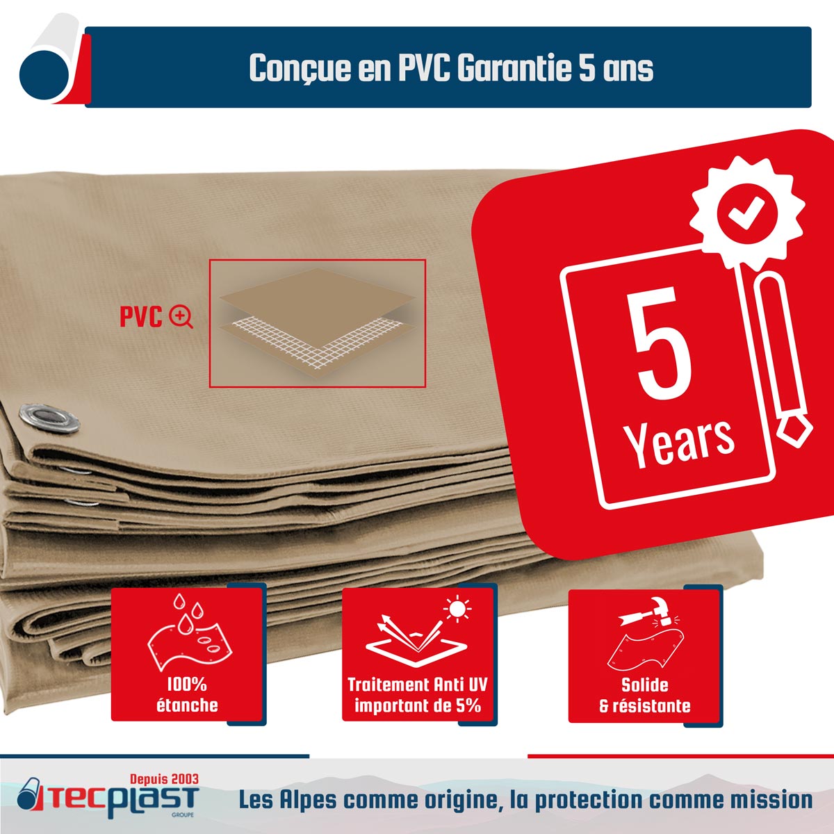 GARANTIE COMMERCIALE TECPLAST - Votre entière satisfaction est une priorité absolue pour TECPLAST. Pour preuve, elle vous fait bénéficier d'une garantie commerciale TECPLAST de 5 ans sur ce produit. Fabriqué avec des matériaux de haute qualité, il vous offrira une tranquillité d'esprit inégalée et participera à la réduction des déchets étant un produit durable dans le temps. La prise en charge est simple et rapide sous réserve d'acceptation par la marque. Veuillez noter que les conditions et usages ci-après n'ouvrent pas le droit à cette garantie. Conditions Météorologiques Extrêmes (vent, grêle, neige...) - Montage et Fixation Inadaptés (prise au vent trop importante, pente insuffisante, mauvaise tension...) - Mauvaise Utilisation (déchirures causées par des objets coupants, brûlures, modifications de la bâche, détournement de l'utilisation normale, destruction par négligence ou volontaire...) - Défaut d'apparence ne nuisant pas aux aspects fonctionnels (décolorations, tâches, mousses, rouille...).| Plus produit |