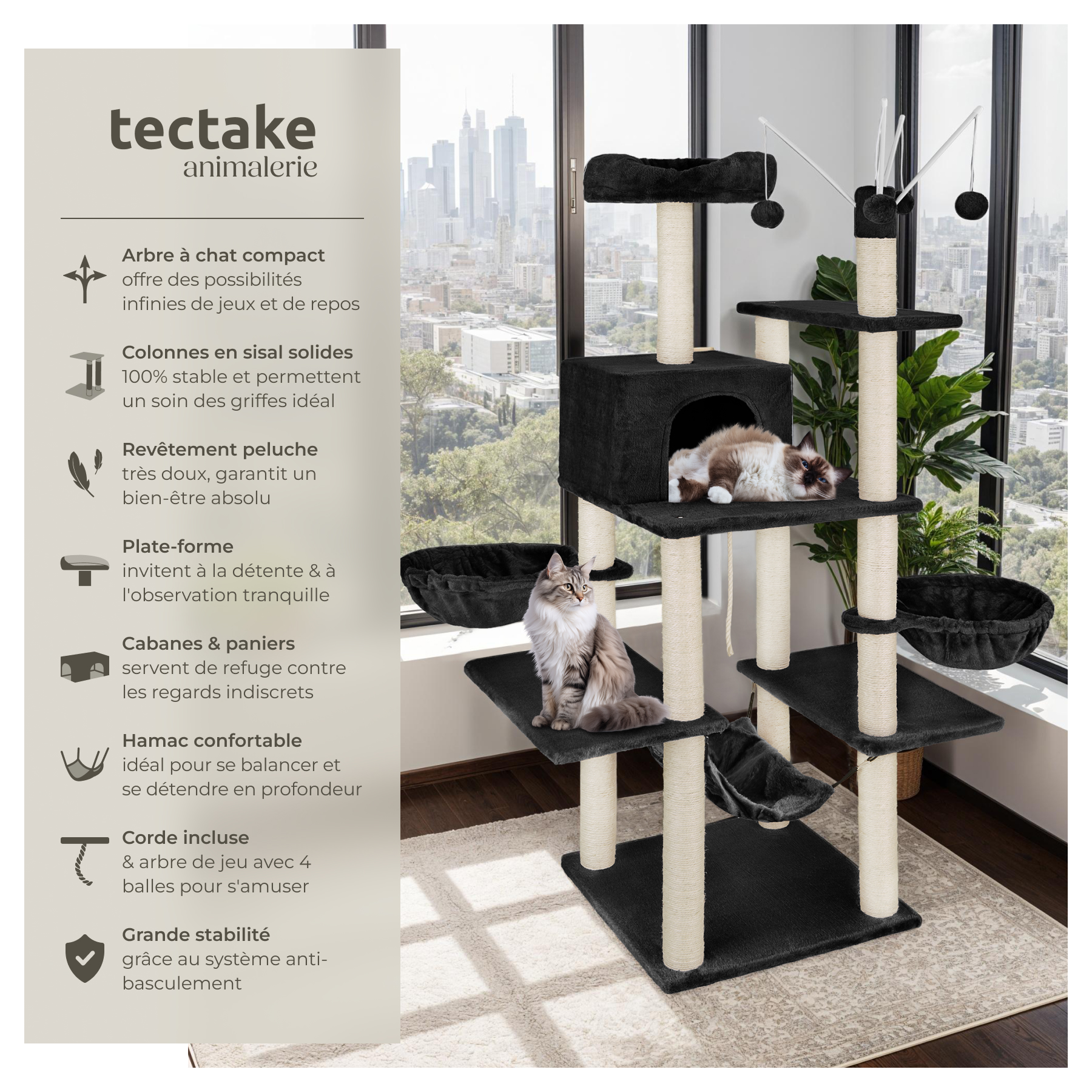 Notre arbre à chat tectake avec son revêtement en peluche tout doux est un véritable paradis pour votre félin. Perché sur la plateforme située à environ 1,65m de hauteur, Mistigri pourra contempler son univers avec ses yeux curieux, excercer ses talents de chasseur en attrapant les balles à l'extrémité des cannes à pêche ou en saisissant la cordette. Une fois fatigué par ces activités, il pourra se blottir à l'abri dans la niche centrale, s'allonger sur le hamac tendu entre deux plateaux comme les panthères de la jungle ou se reposer dans l'une des deux couchettes. Les troncs couverts de sisal résistant permettent à votre animal de compagnie de se faire les griffes, il satisfait donc ses instincts naturels sur ces griffoirs en évitant d'endommager votre canapé, vos meubles et vos murs. Notre arbre à large base permet à plusieurs chats de s'amuser en même temps. Il contribue à leur bien-être en lui offrant à la fois une stimulation par le jeu, un abri pour dormir et de quoi aiguiser ses griffes.
