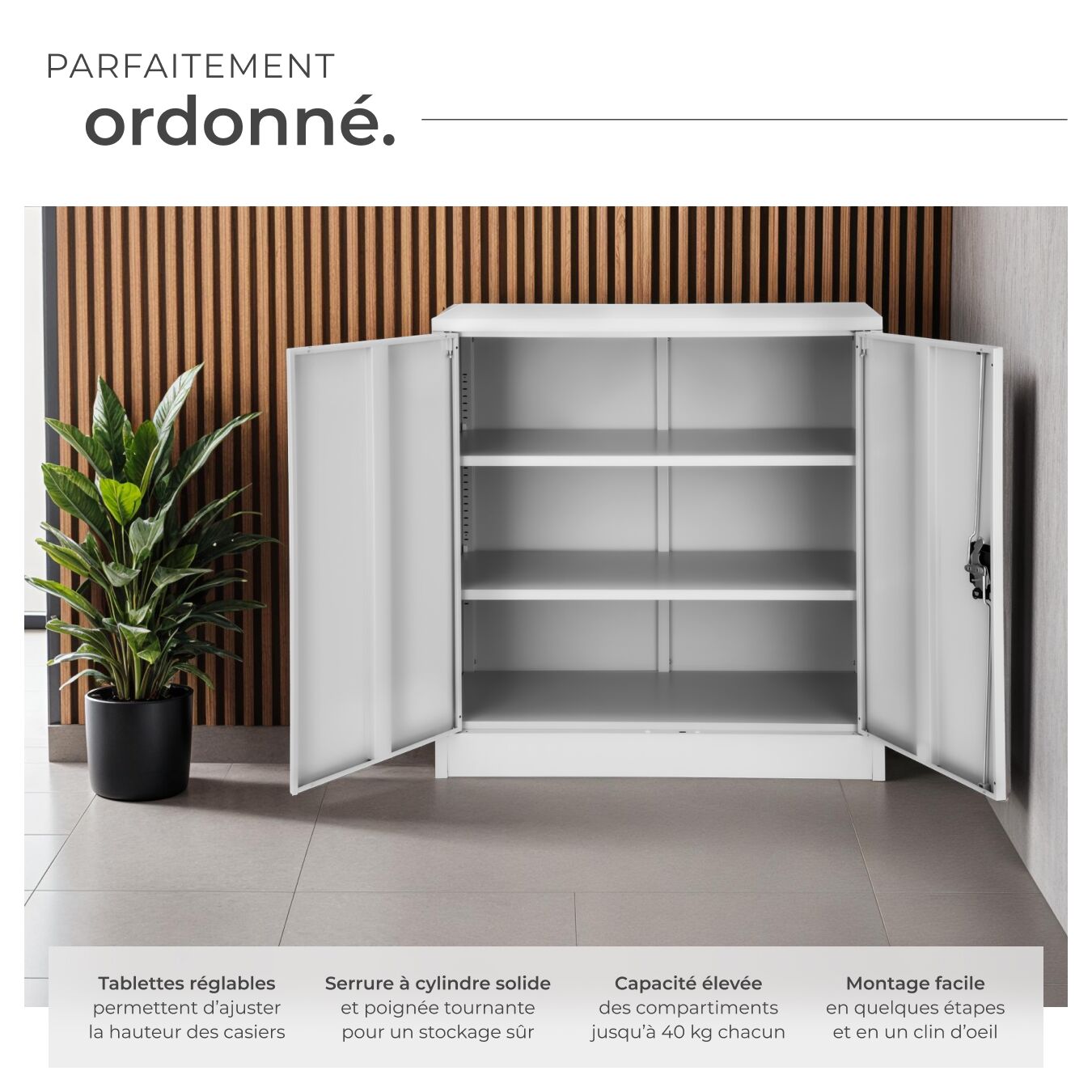 - Armoire de bureau verrouillable dotée de 2 étagères.