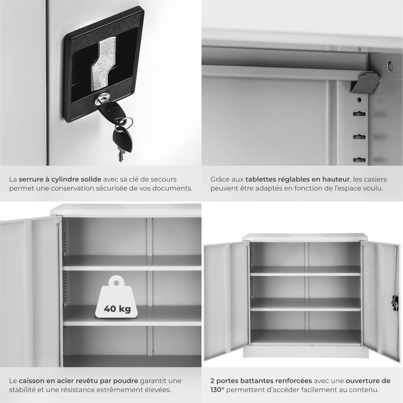 Grâce à ses étagères réglables en hauteur individuellement, cette armoire métallique s'adapte parfaitement à vos besoins. Que vous ayez des livres, des classeurs ou des fournitures de bureau, vous pouvez ajuster les étagères pour maximiser l'espace de rangement. Les portes battantes renforcées avec un angle d'ouverture de 130° et équipées de tampons en caoutchouc amortisseurs de bruit assurent une utilisation silencieuse et pratique.