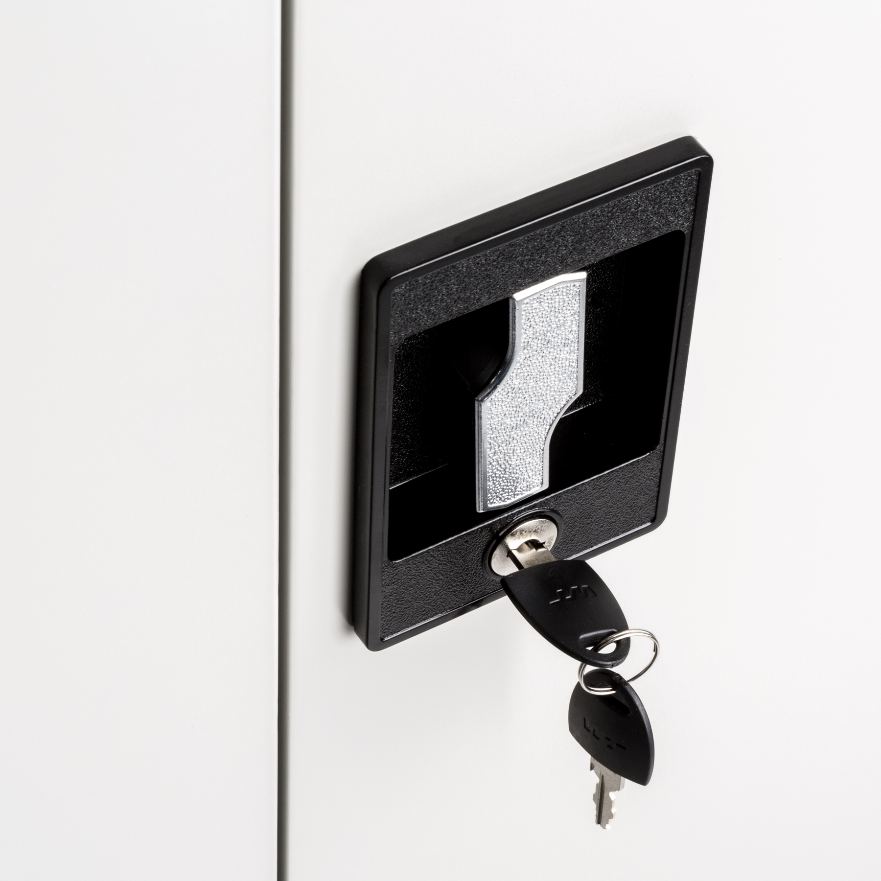 - Fermeture avec poignée tournante et serrure à cylindre avec deux clés.