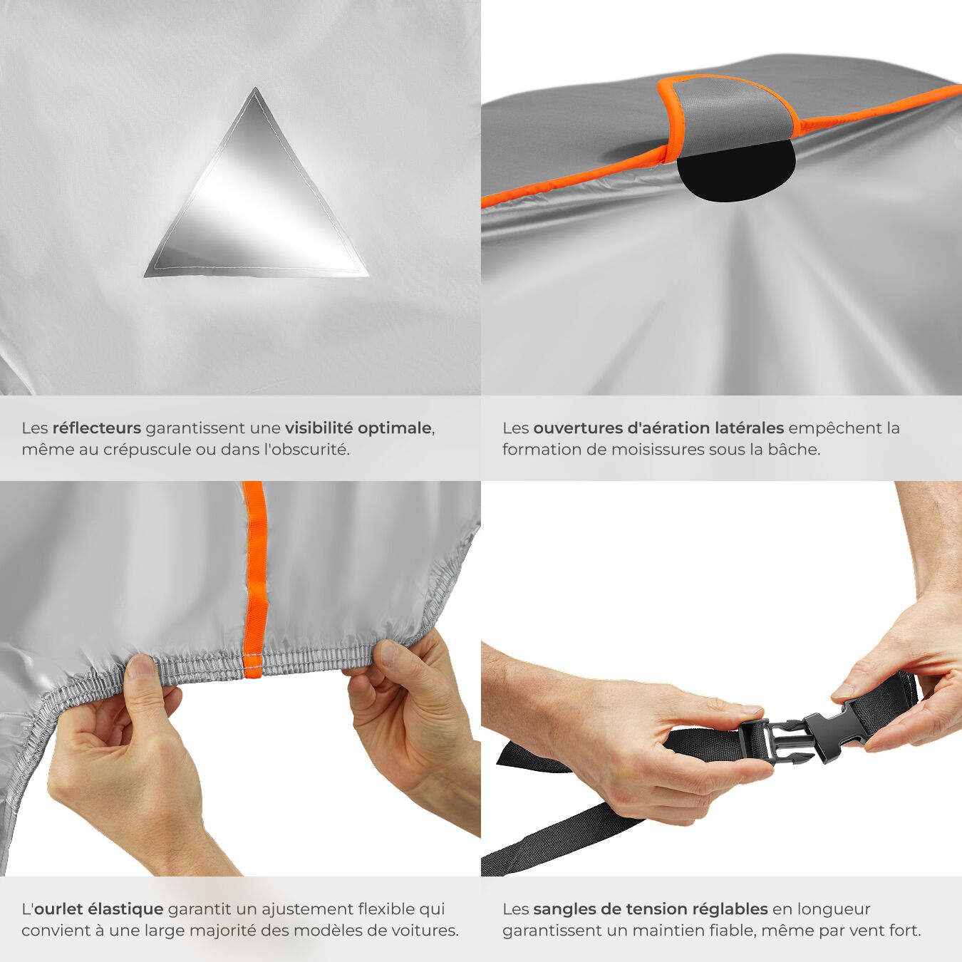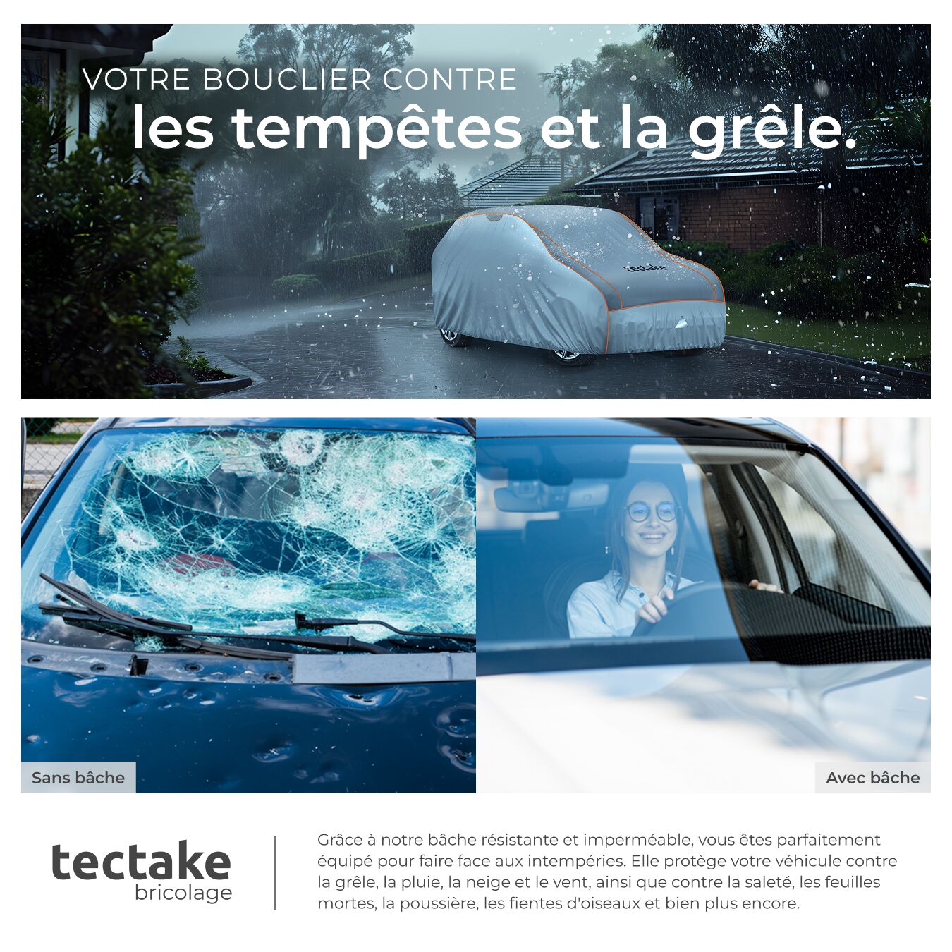 Passer le carrousel d'imagesAvec cette bâche anti-grêle imperméable de tectake et son sac de rangement, votre voiture est parfaitement protégée contre toutes intempéries. Une couche de mousse dense sur le dessus amortit efficacement l'impact de la grêle, de petites branches et autres tandis que les ouvertures de ventilation préviennent en même temps la formation de moisissures. Grâce à l'ourlet élastique, la bâche s'adapte idéalement à la voiture et la sangle de serrage réglable en longueur offre une sécurité supplémentaire. 3 sangles de serrage réglables en longueur et des bandes orange assurent une bonne visibilité de la housse de protection même dans l'obscurité : une protection complète optimale.