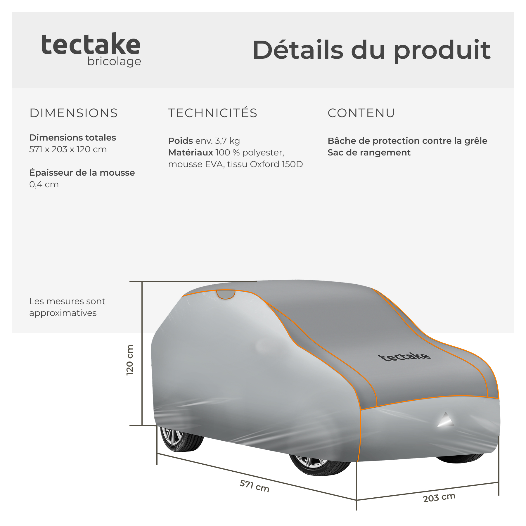 | Libellé | TECTAKE Bâche de voiture imperméable et respirante avec couche en mousse de 4 mm SUV / VAN GRAND (571 x 203 x 120 cm) gris |