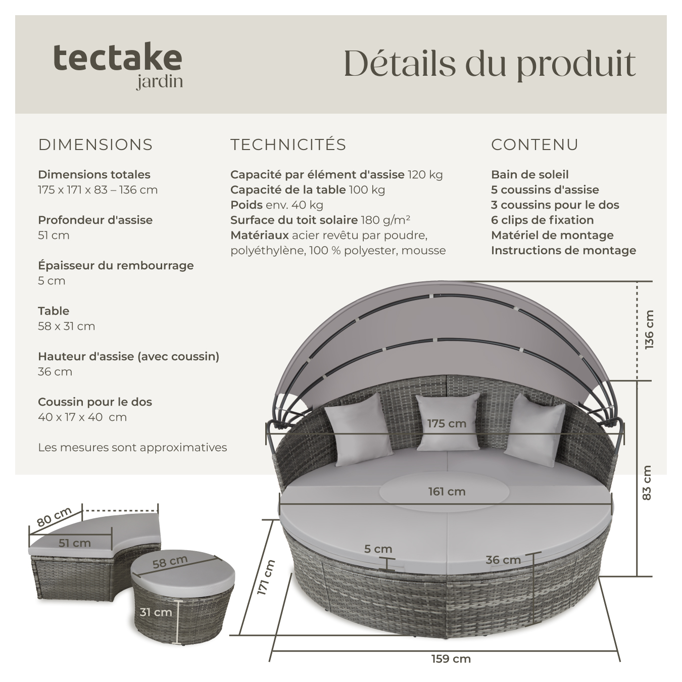 | Libellé | TECTAKE Bain de soleil rond au design contemporain luxueux robuste gris |