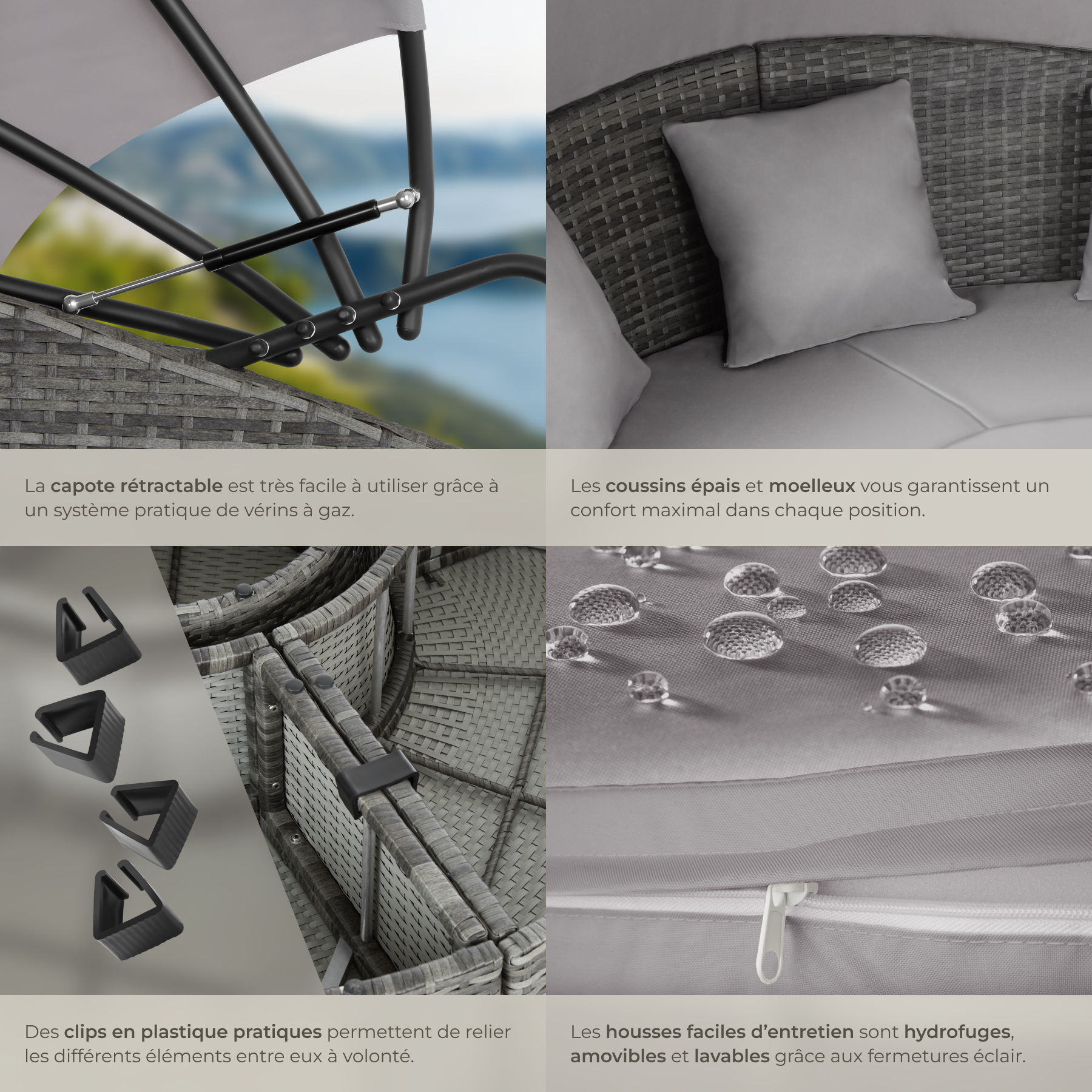 Découvrez le bain de soleil rond au design contemporain luxueux SANTORIN, conçu pour transformer votre jardin, terrasse ou piscine en un véritable havre de paix. Avec ce mobilier de jardin modulable, vous pouvez créer une atmosphère de détente parfaite grâce à son design élégant et ses caractéristiques innovantes.