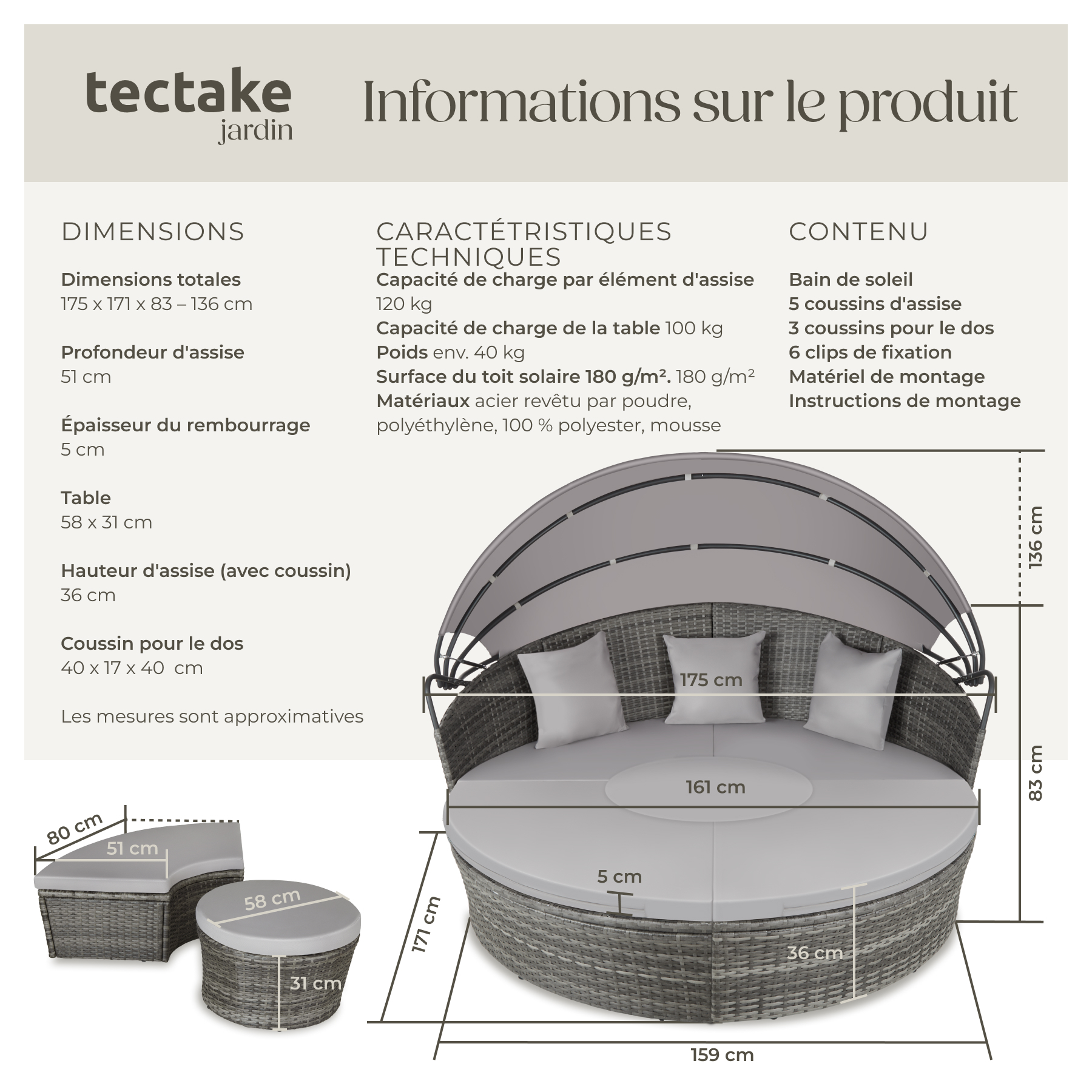 | Libellé | TECTAKE Bain de soleil rond au design contemporain luxueux robuste gris/gris clair |