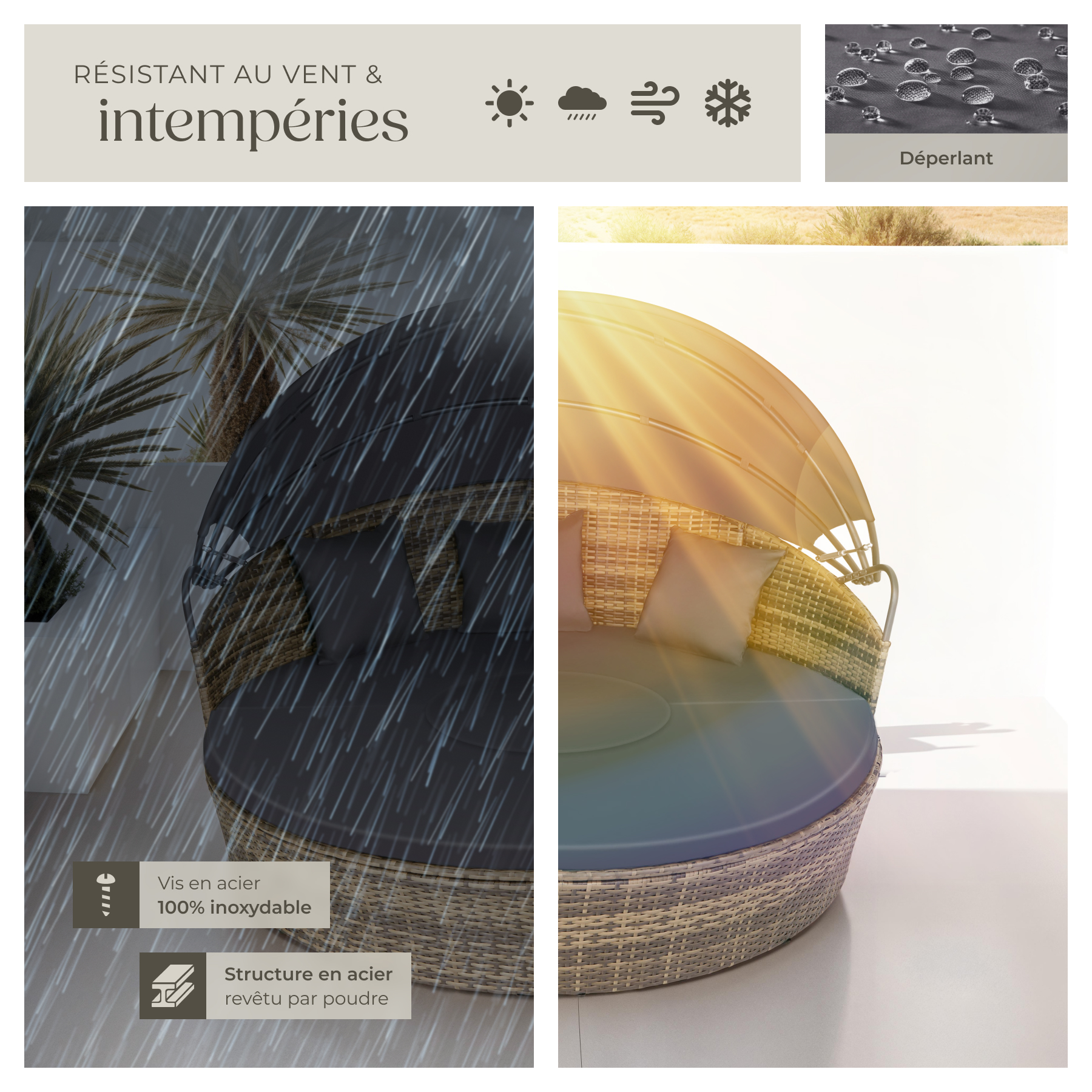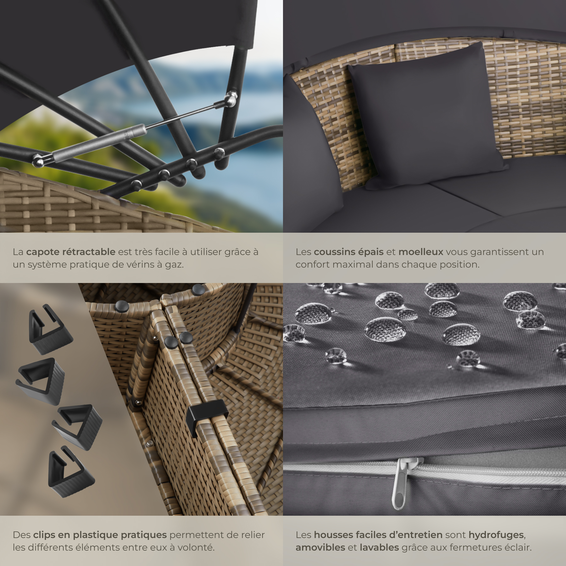 Découvrez le bain de soleil rond au design contemporain luxueux SANTORIN, conçu pour transformer votre jardin, terrasse ou piscine en un véritable havre de paix. Avec ce mobilier de jardin modulable, vous pouvez créer une atmosphère de détente parfaite grâce à son design élégant et ses caractéristiques innovantes.