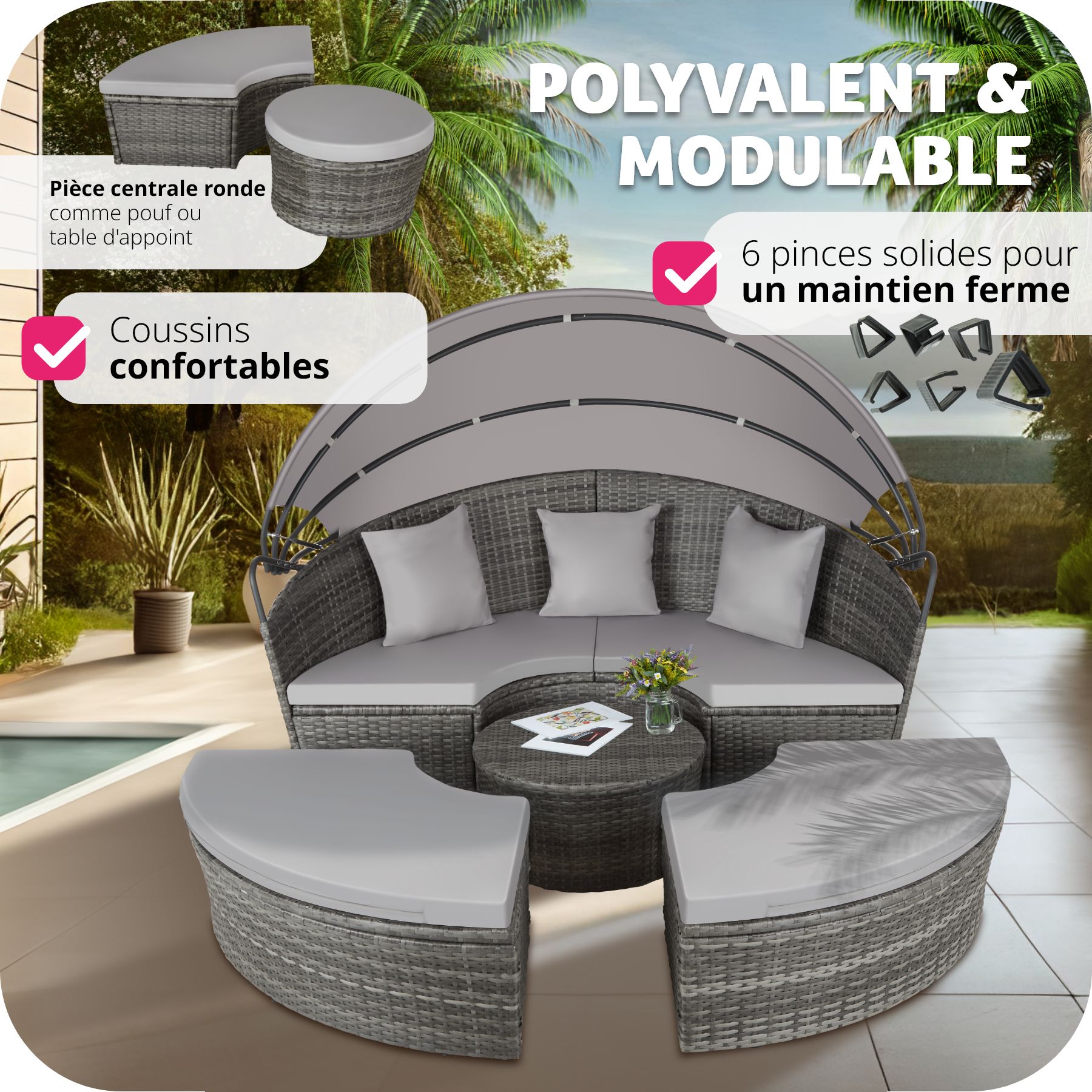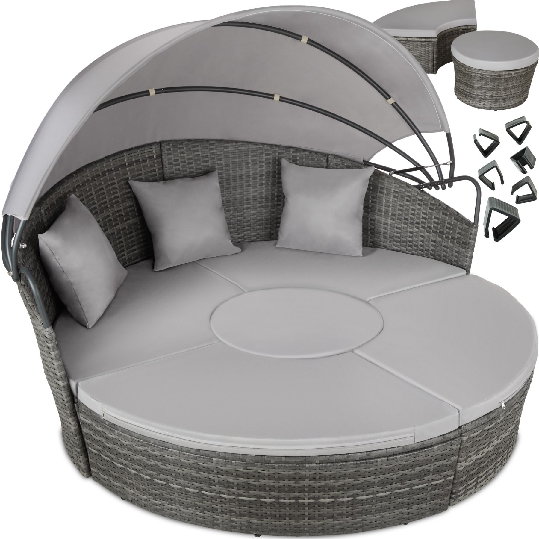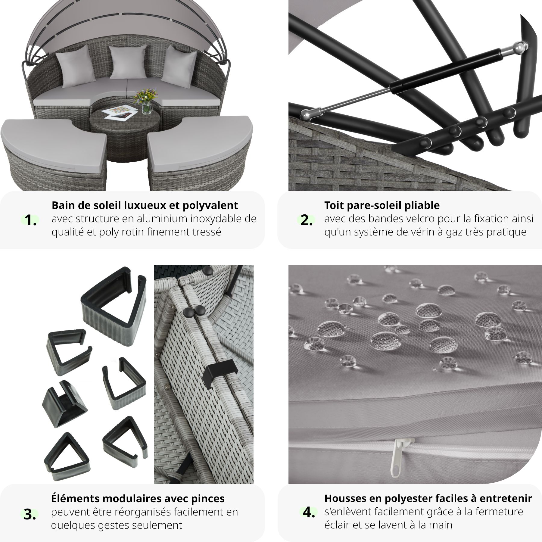 - Canapé lit de jardin d'extérieur rond, modulable, en Aluminium et Poly Rotin avec toit pare-soleil pliable à l'aide de deux vérins à gaz.