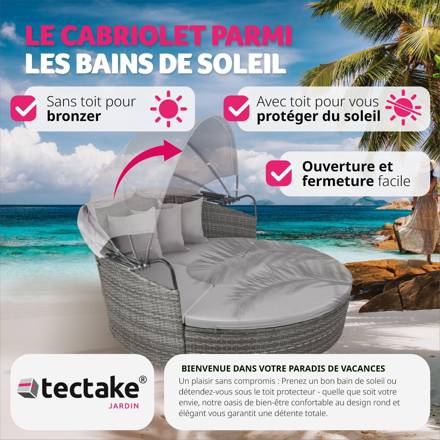 Salon de Jardin, Chaise Longue, Transat, Bain de Soleil Coquille en Aluminium et Résine Tressée + Pare Soleil + 3 Coussins TECTAKE. Ce canapé lit de jardin d'extérieur rond, modulable, en Aluminium et Poly Rotin transformera votre jardin, votre terrasse, votre jardin d'hiver, votre balcon ou SPA en oasis de bien-être. Le toit pare-soleil pliable (Rabattable) offre un ombrage agréable pendant les belles journées ensoleillées et vous protège efficacement du vent. Utilisable comme ensemble table / fauteuils pour recevoir ses amis ou comme lit confortable pour profiter d'un moment de détente. Changez la disposition de ce salon de jardin en un tour de main. Ce bain de soleil en résine tressée est un véritable accroche regard. C'est un must absolu dans votre espace bien-être.