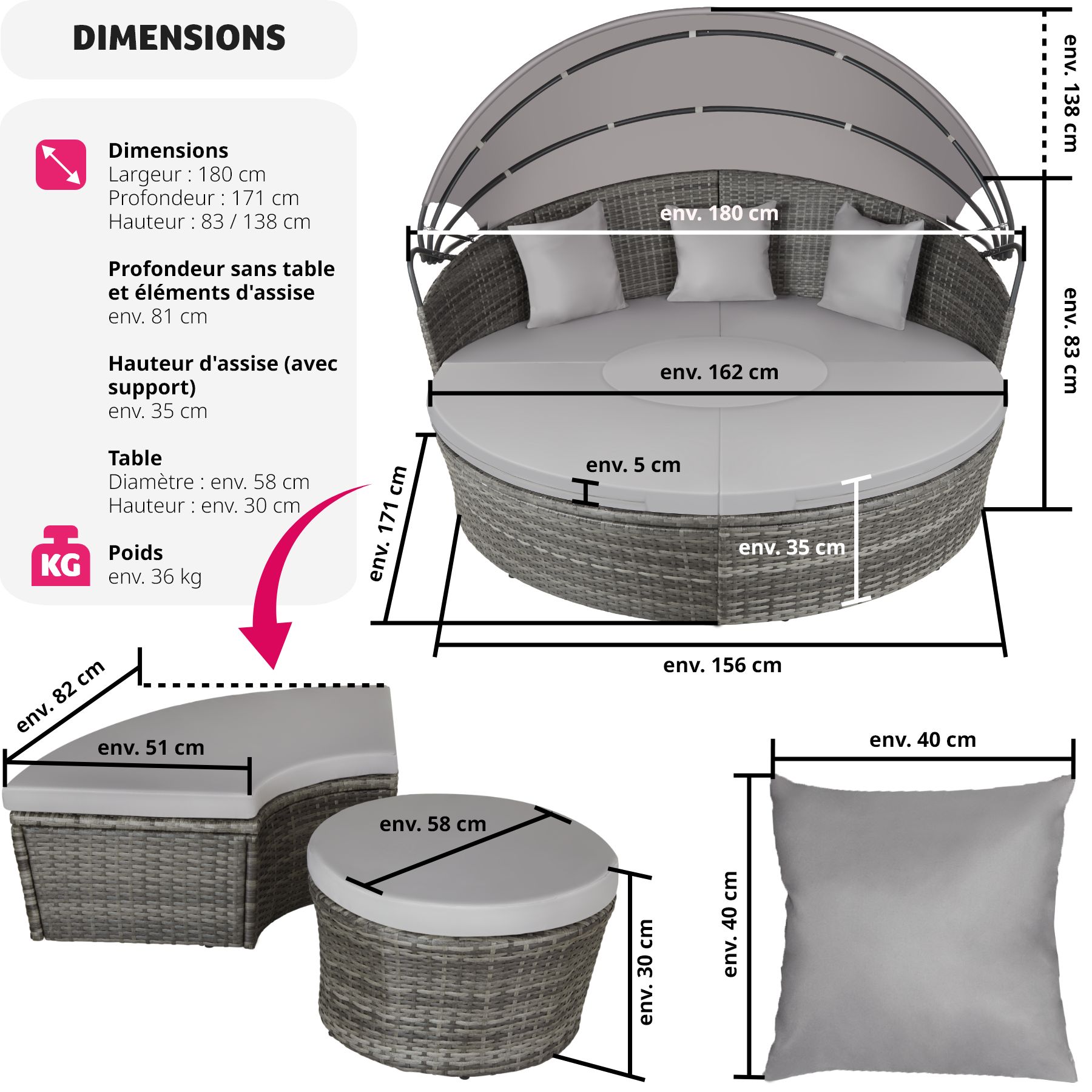 - Profondeur sans table et éléments d'assise : env. 81 cm