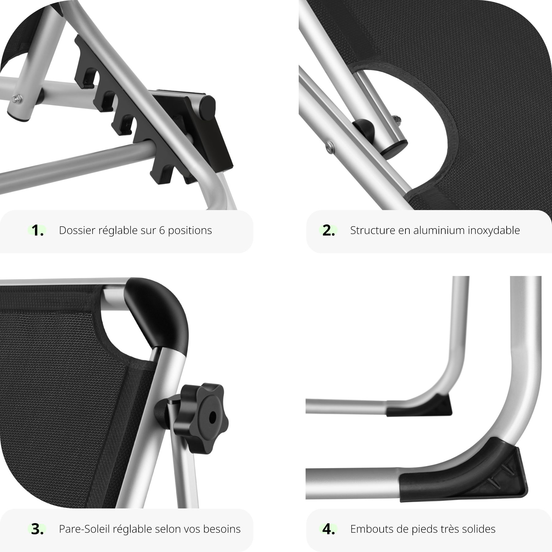 Notre magnifique bain de soleil Aurélia est le mobilier de jardin idéal pour profiter au mieux de l'été. Le dossier réglable en six positions et le pare-soleil ajustable vous offrent un confort maximal. La toile robuste est extrêmement résistante à la déchirure, très perméable à l'air et facile à nettoyer. La structure en aluminium est légère et pliable et facilite le transport de votre transat d'extérieur.