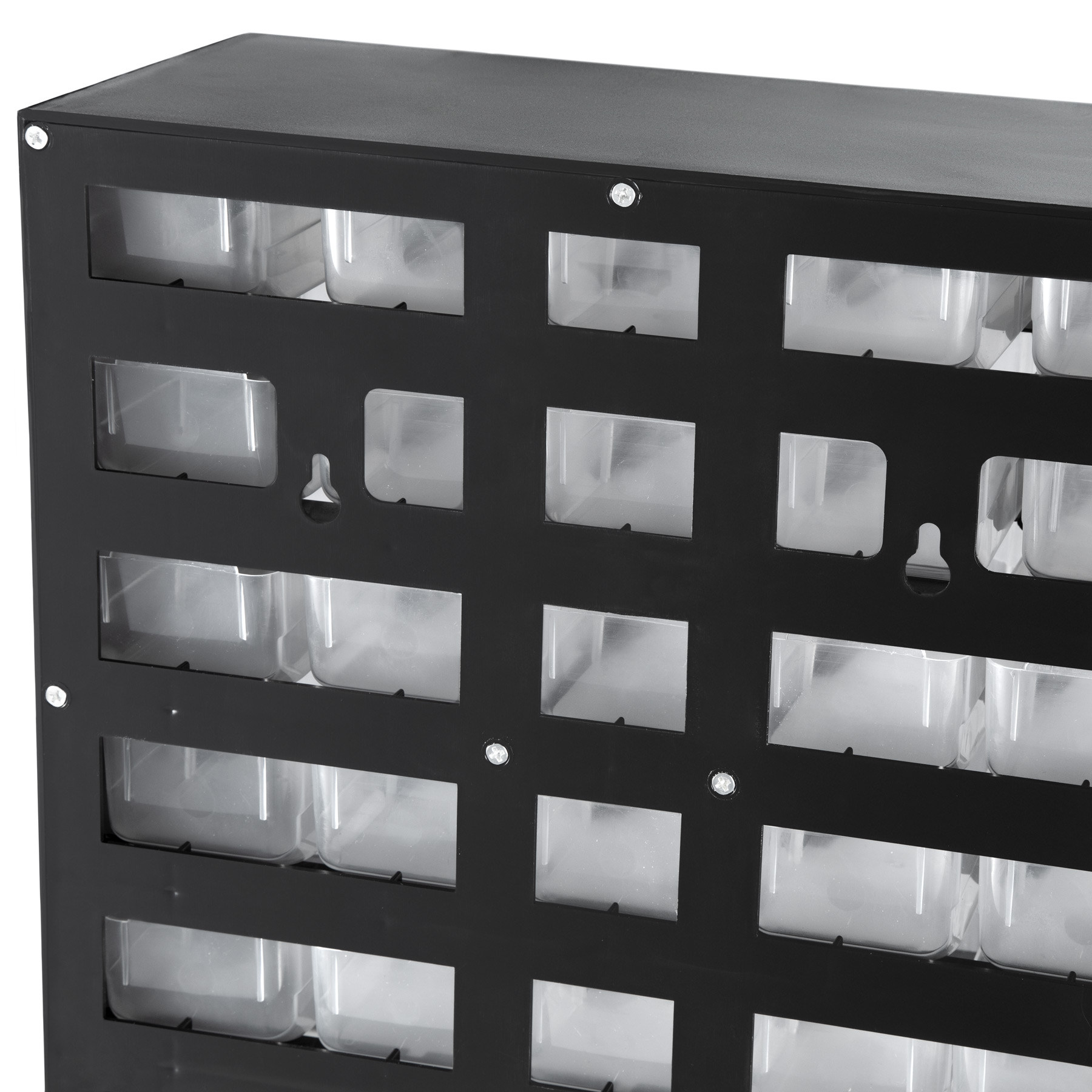 Casier à vis 41 Tiroirs Etagère Caisse de Rangement Bricolage en Plastique 30 cm x 13,5 cm x 45 cm TECTAKE. Toutes les pièces visibles d'un seul coup d'oeil et triées rigoureusement c'est possible ! Notre casier à vis polyvalent crée un système de rangement organisé et soigné. Les 41 tiroirs transparents sont parfaits pour conserver des vis, des composants, des bijoux, des petites pièces, des clous, chevilles et tant d'autres. Les modules flexibles peuvent s'enlever complètement et s'empiler. Au besoin, il est possible de doubler le nombre de tiroirs grâce à des séparateurs. Les deux options de suspension de l'étagère en plastique garantissent un maintien stable contre le mur, même quand les tiroirs sont remplis. Fini le bazar et les recherches fastidieuses grâce à notre étagère de rangement à tiroirs.