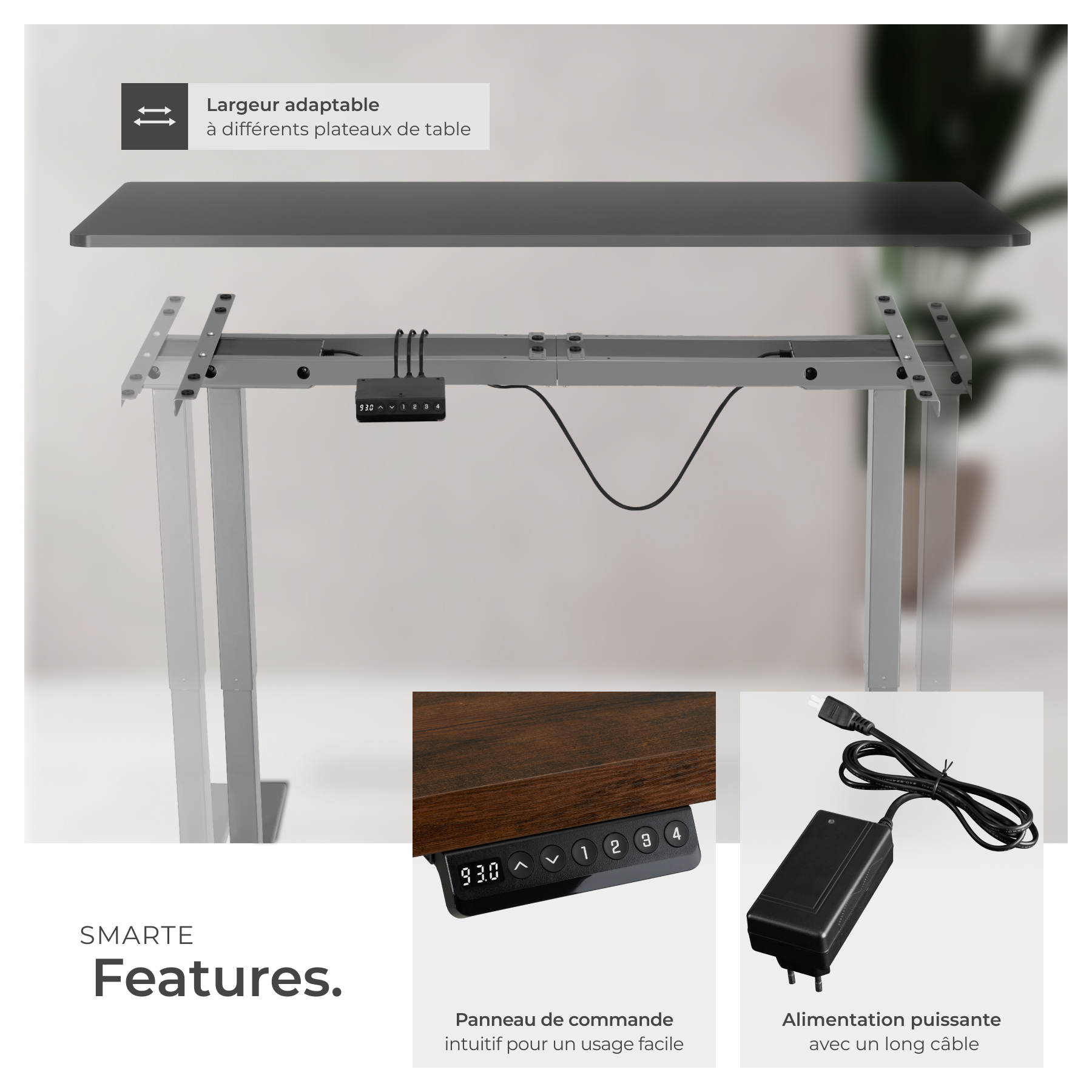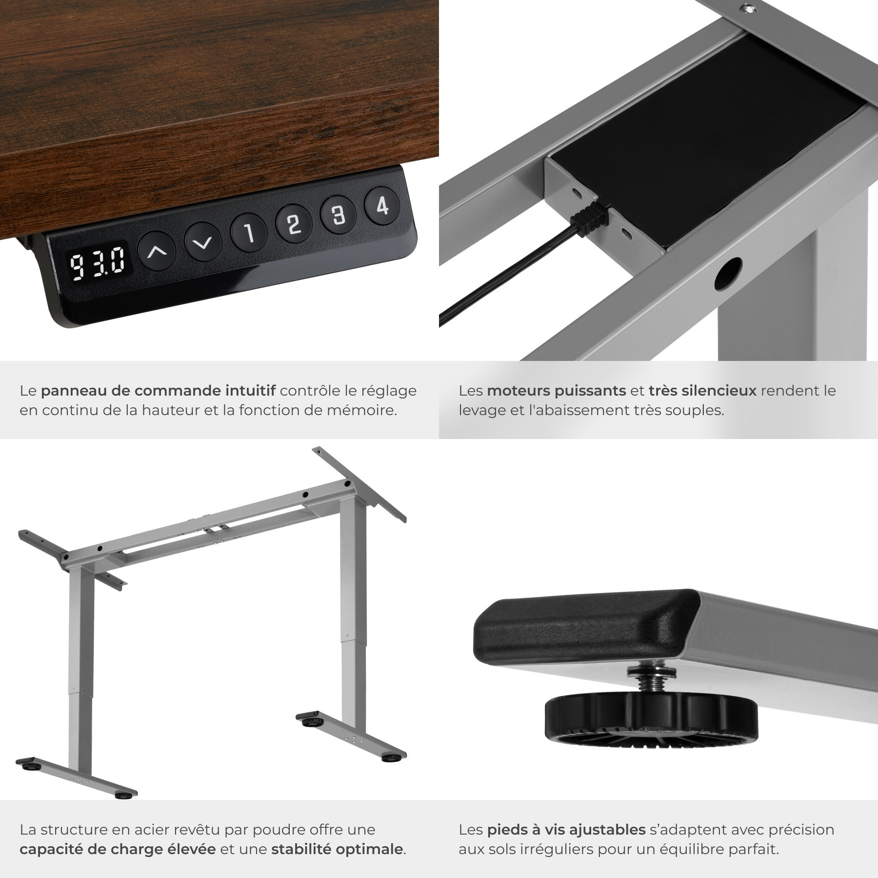 Boostez votre concentration et votre productivité, tout en préservant votre santé, avec notre bureau assis debout MELVILLE polyvalent de tectake. L'interrupteur permet de régler électriquement la hauteur souhaitée avec précision, rapidité et silence. En plus, vous pouvez enregistrer le réglage obtenu grâce à la fonction mémoire. Le système anticollision intelligent détecte les obstacles et arrête le moteur avant d'abîmer quelque chose ou de blesser quelqu'un. Cette structure, dont la largeur est également variable, fonctionne avec un large éventail de plateau. Choisissez le piètement de bureau MELVILLE réglable de tectake pour une flexibilité à toute épreuve.