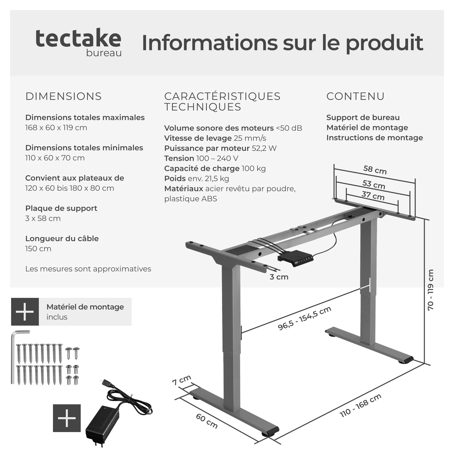 | Libellé | TECTAKE Bureau assis debout avec réglage électrique de la hauteur gris |