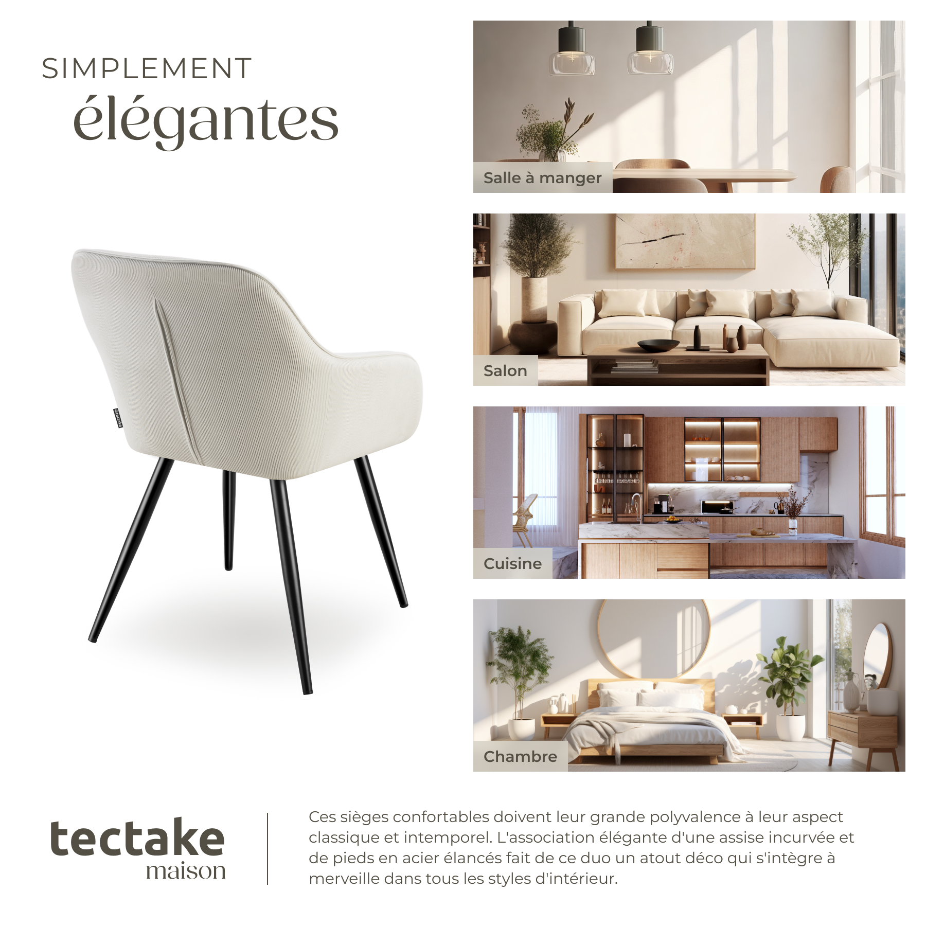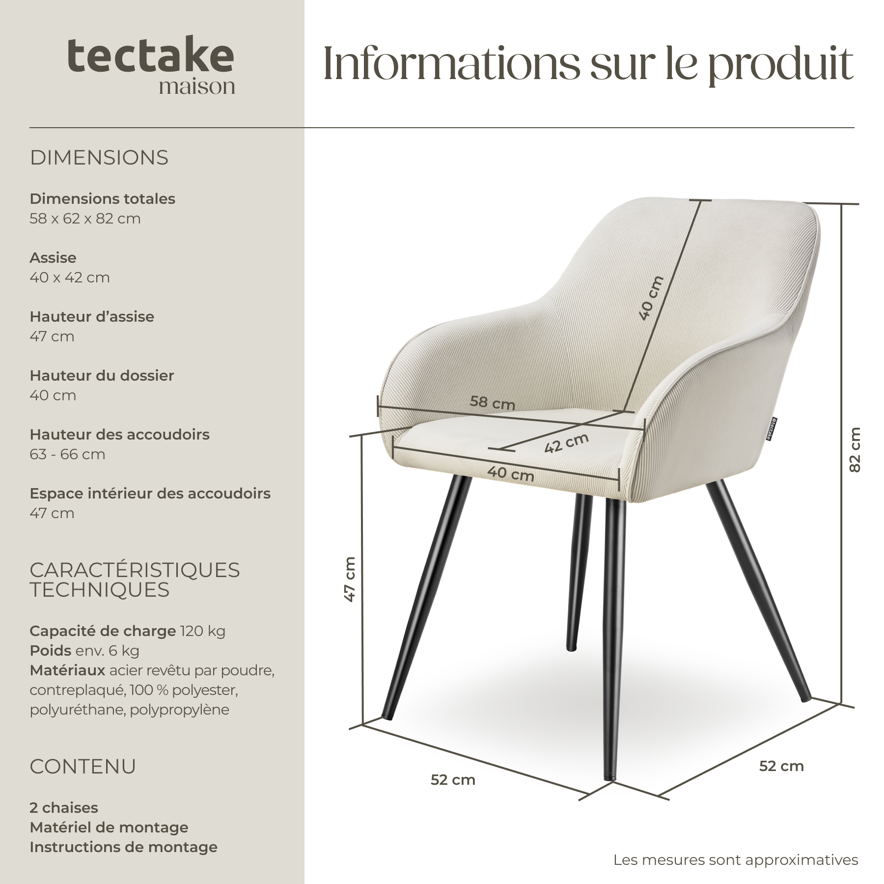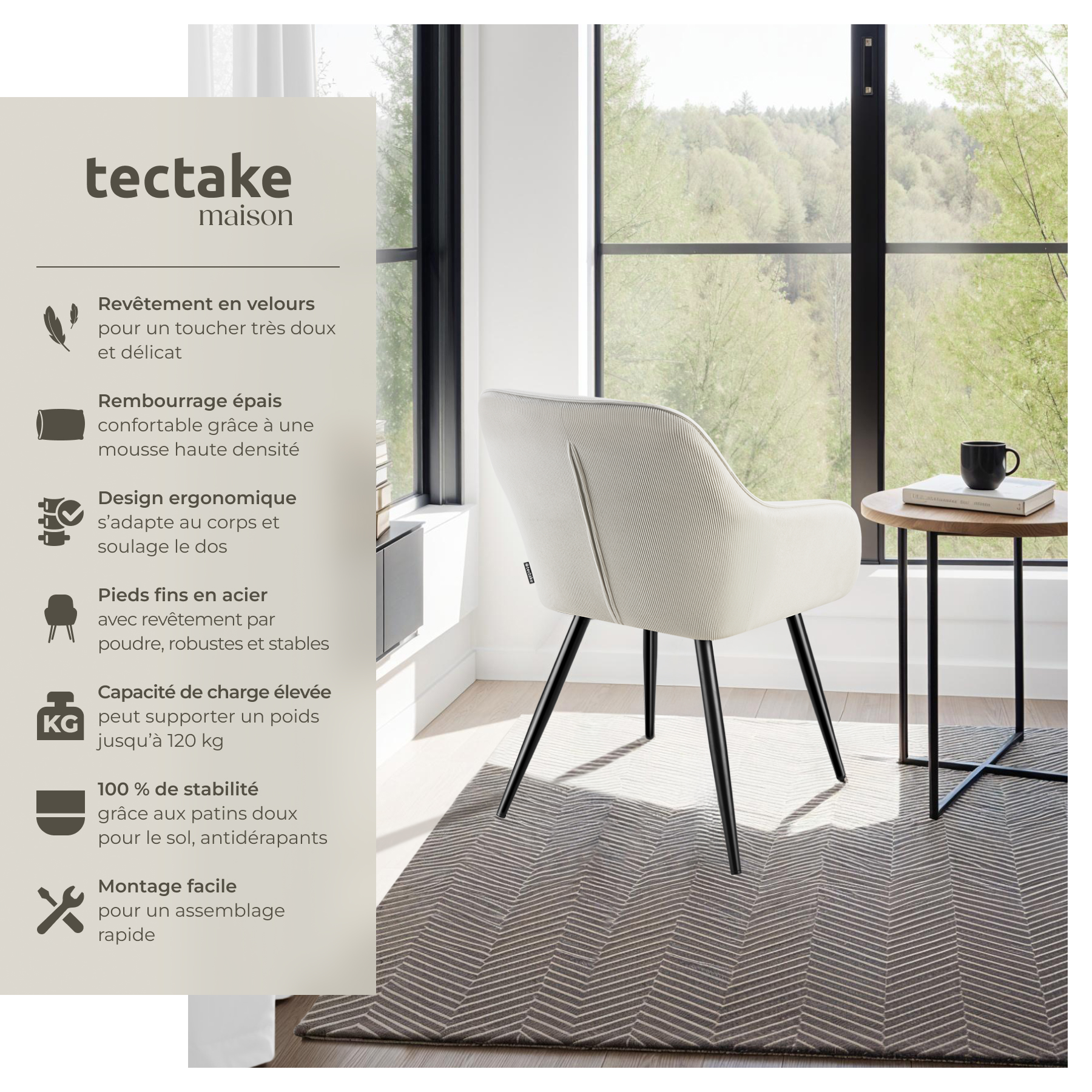 | Libellé | TECTAKE Chaise de salle à manger rembourrée en velours côtelé Lot de 2 crème/noir |