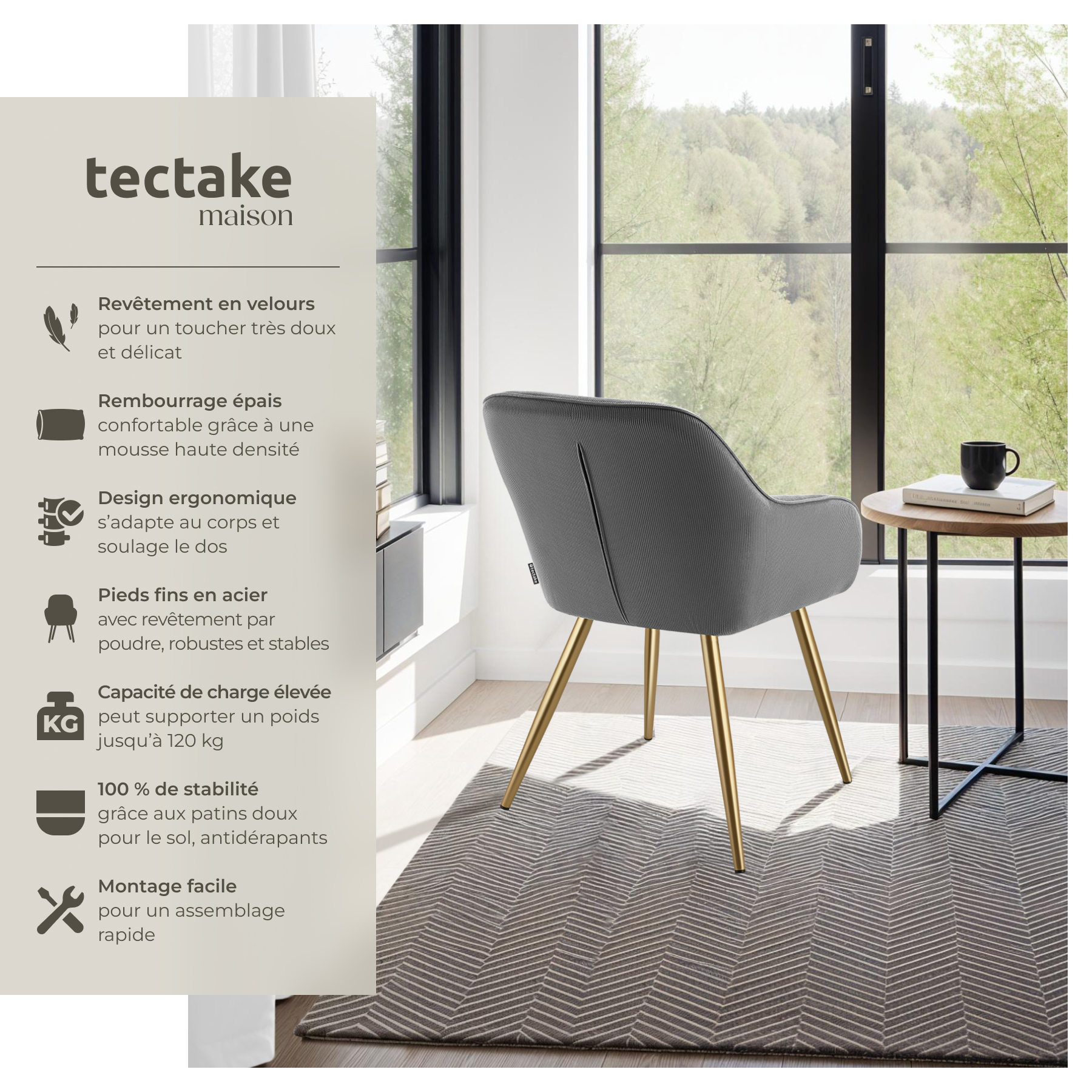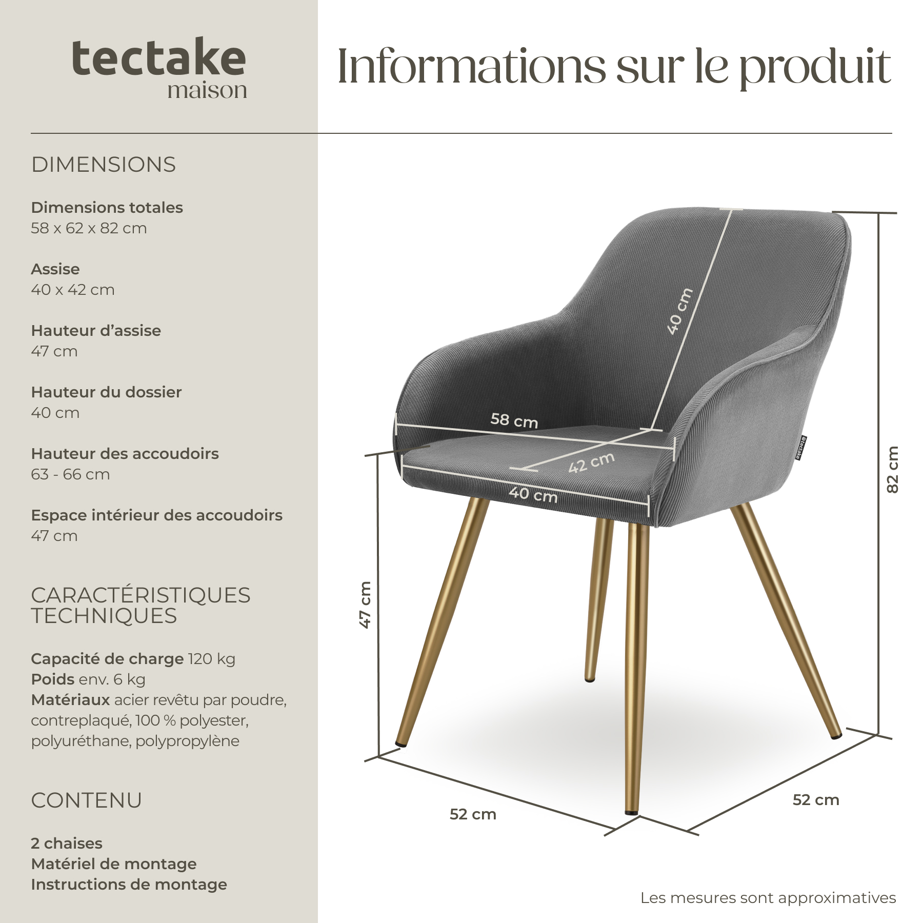 | Libellé | TECTAKE Chaise de salle à manger rembourrée en velours côtelé Lot de 2 gris/jaune or |