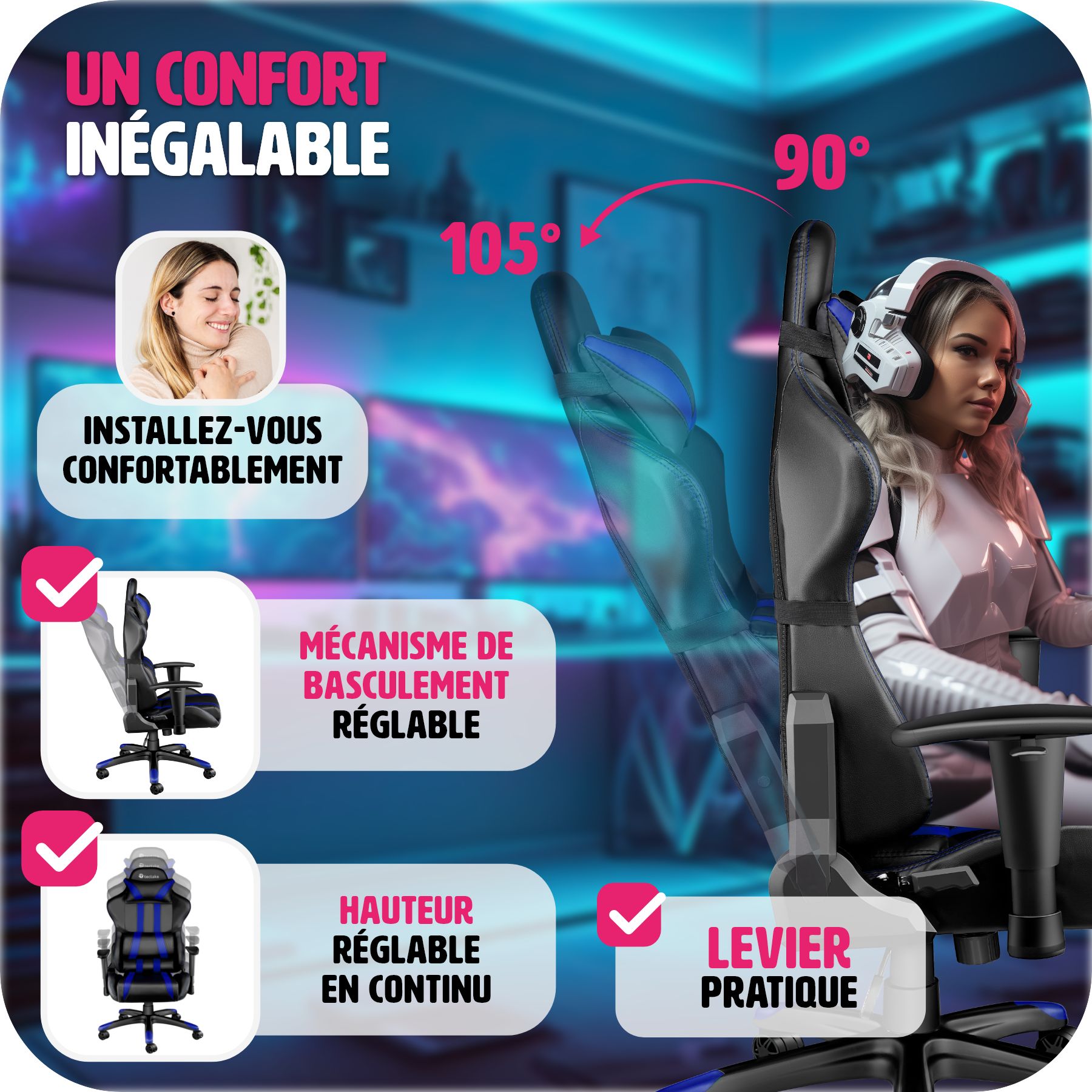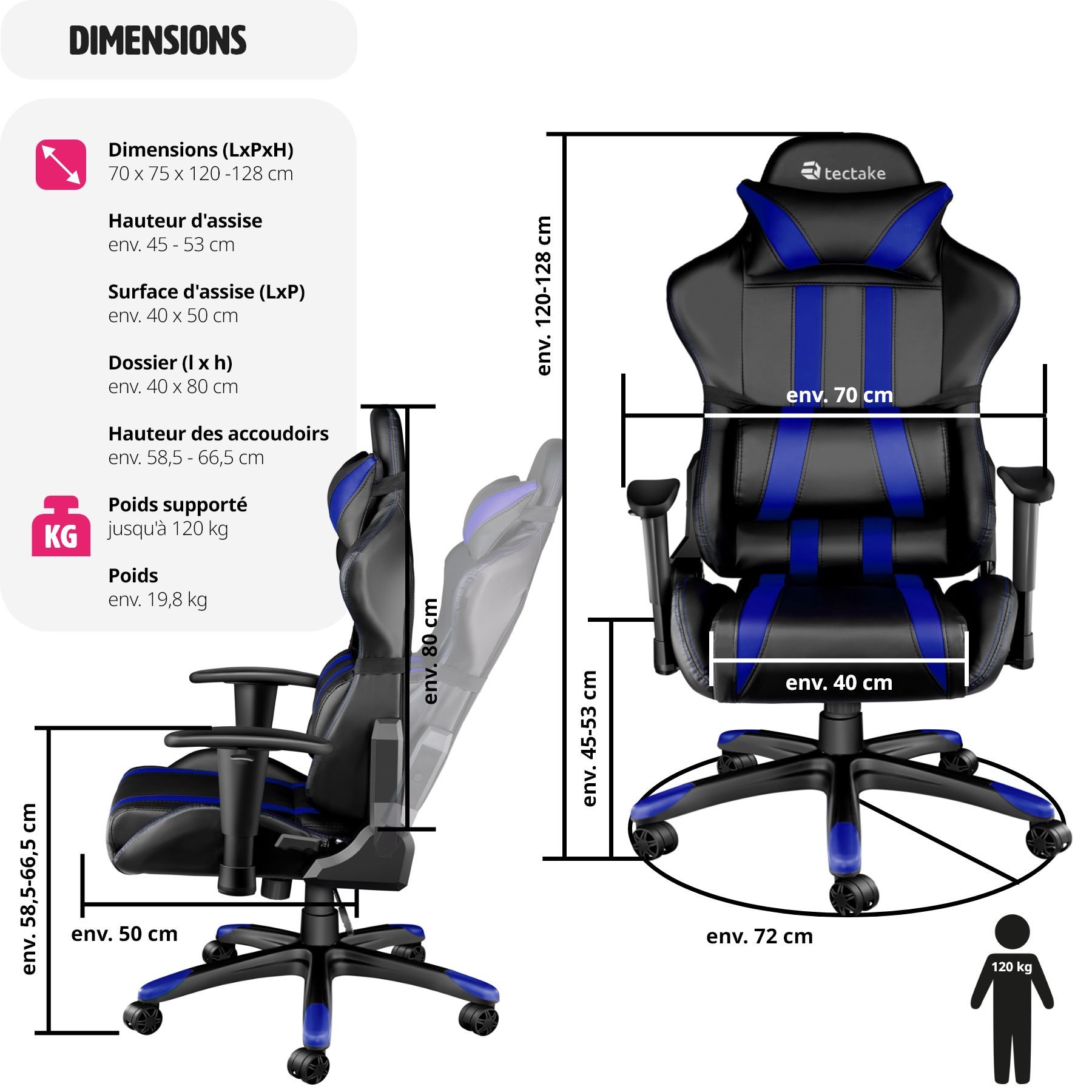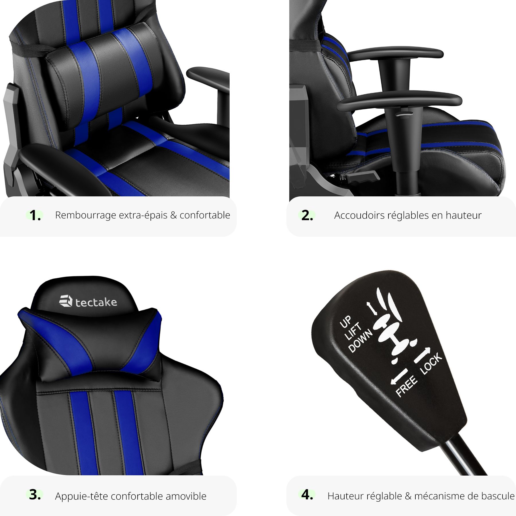 | Libellé | Tectake Chaise gamer avec coussin de tête et lombaires - noir/bleu |