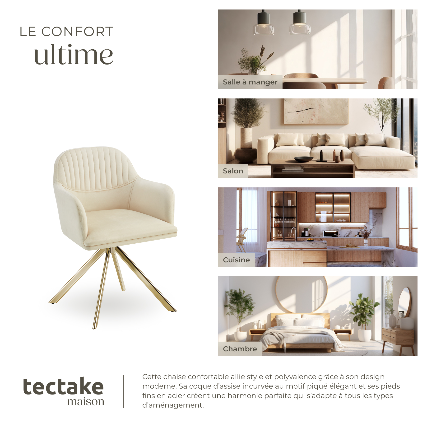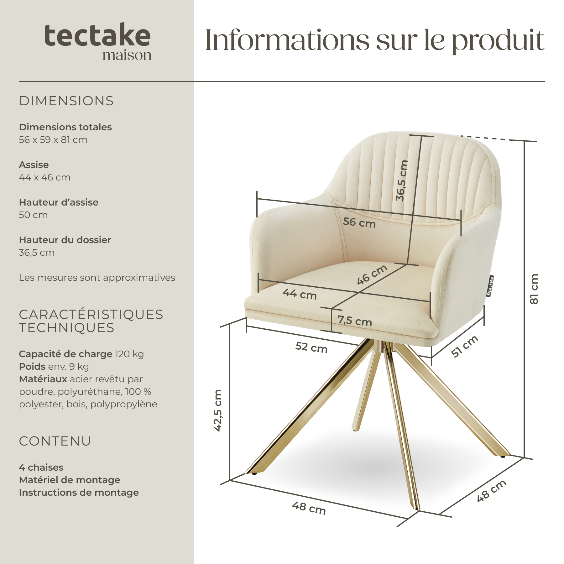 | Libellé | TECTAKE Chaise pivotante en velours rembourrée Lot de 4 crème/or |