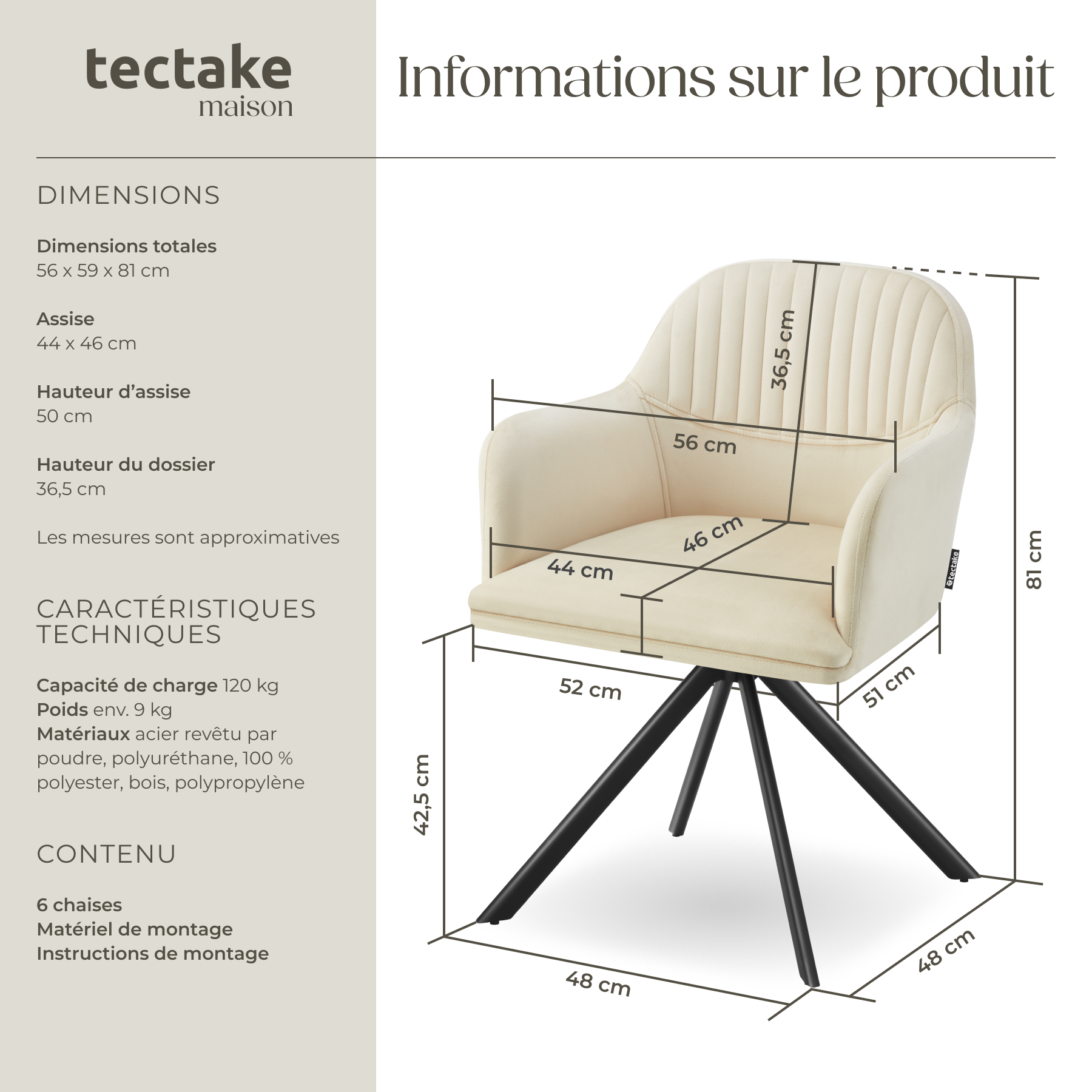 | Libellé | TECTAKE Chaise pivotante en velours rembourrée Lot de 6 crème/noir |