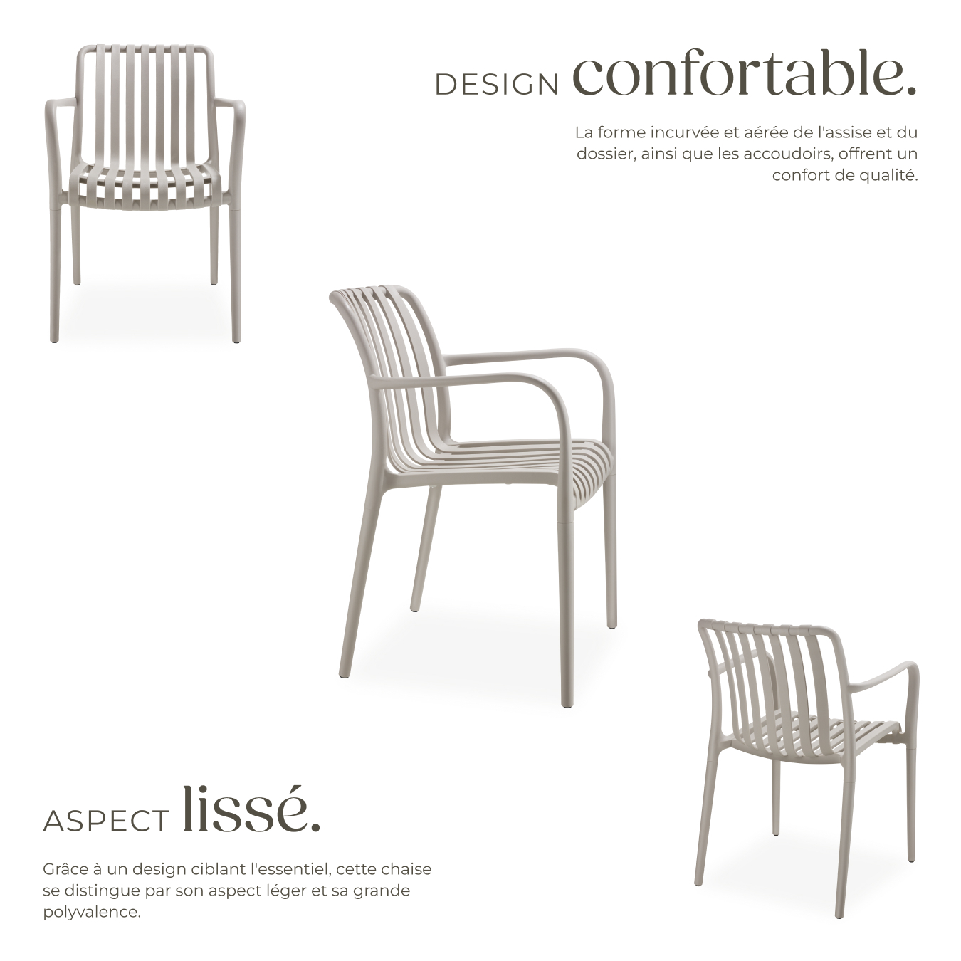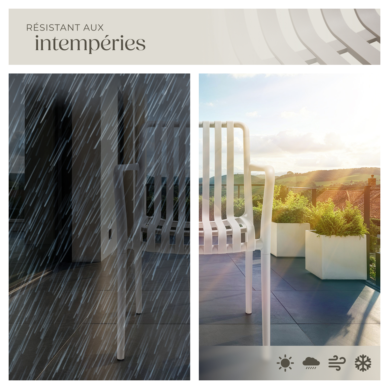 Conçues en plastique de haute qualité, ces chaises sont à la fois robustes, faciles d’entretien et résistantes aux intempéries. Pluie, chaleur ou rayons UV : elles conservent leur aspect et leur solidité au fil du temps, offrant ainsi une longévité remarquable. Leur matériau résistant assure également une excellente stabilité et une capacité de charge élevée.