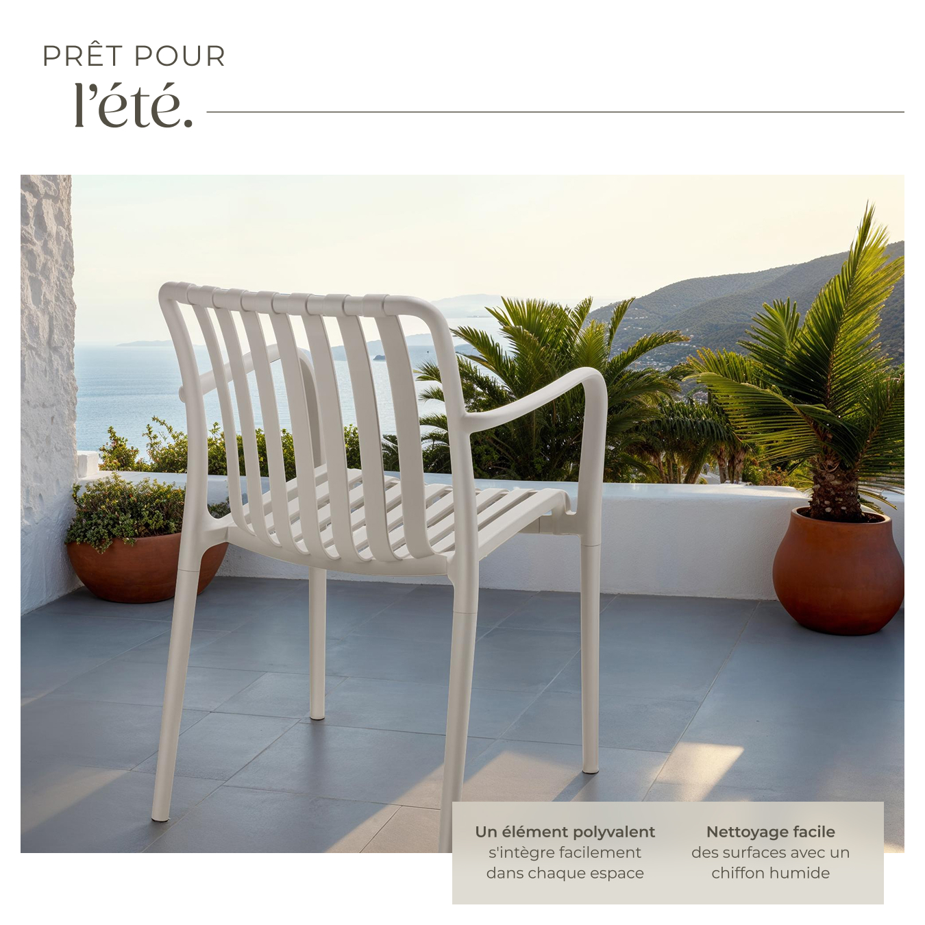 Pour une stabilité absolue sur tous les sols, les patins en caoutchouc antidérapants sur les pieds assurent une sécurité optimale. Pratique et fonctionnelles : lorsqu'elles ne sont pas utilisées, les chaises peuvent être empilées les unes sur les autres pour un rangement peu encombrant. Que ce soit pour un petit-déjeuner ensoleillé ou un moment de détente en plein air, les chaises Alcudia de tectake sont le choix idéal !