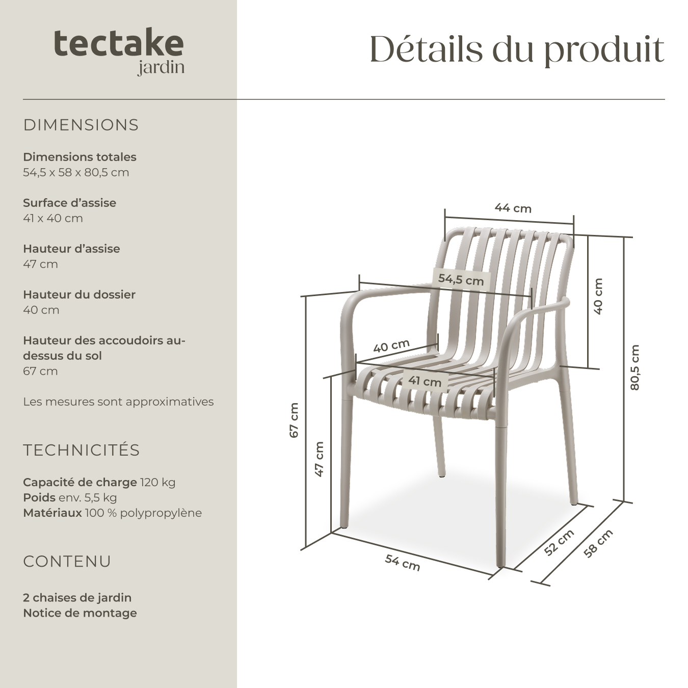 | Libellé | TECTAKE Chaises de jardin résistant aux intempéries et aux UV Ensemble de 2 pièces taupe |