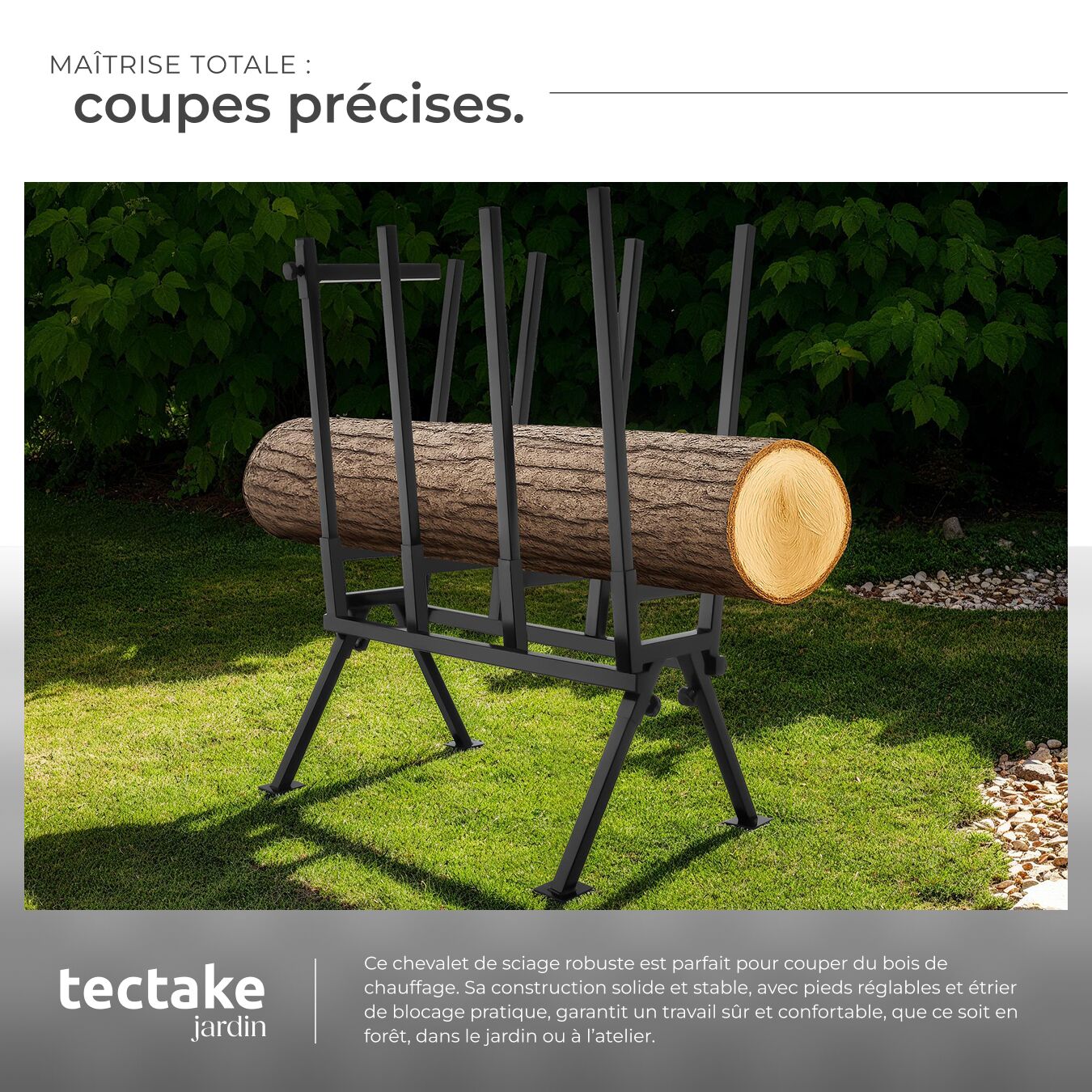 Chevalet à bûches, Chevalet de sciage, Chevalet de tronçonnage TECTAKE. Travaillez plus souvent dans votre jardin ! Avec notre chevalet de sciage stable et pratique vous traitez de grandes quantités de bois en peu de temps ! La barre de blocage réglable adapte la quantité de bois au chevalet, afin qu'il soit encadré et son emplacement sécurisé.