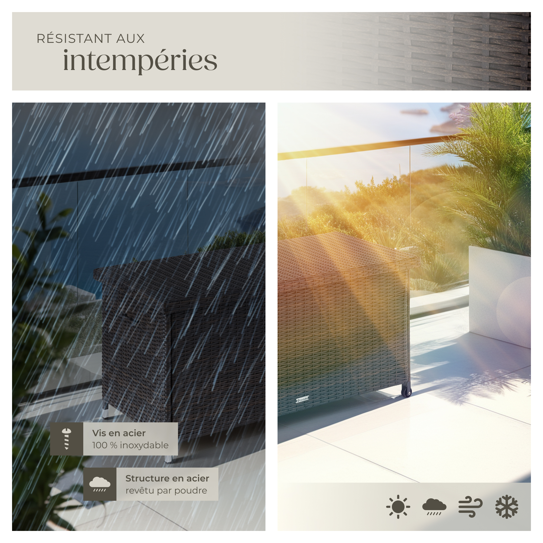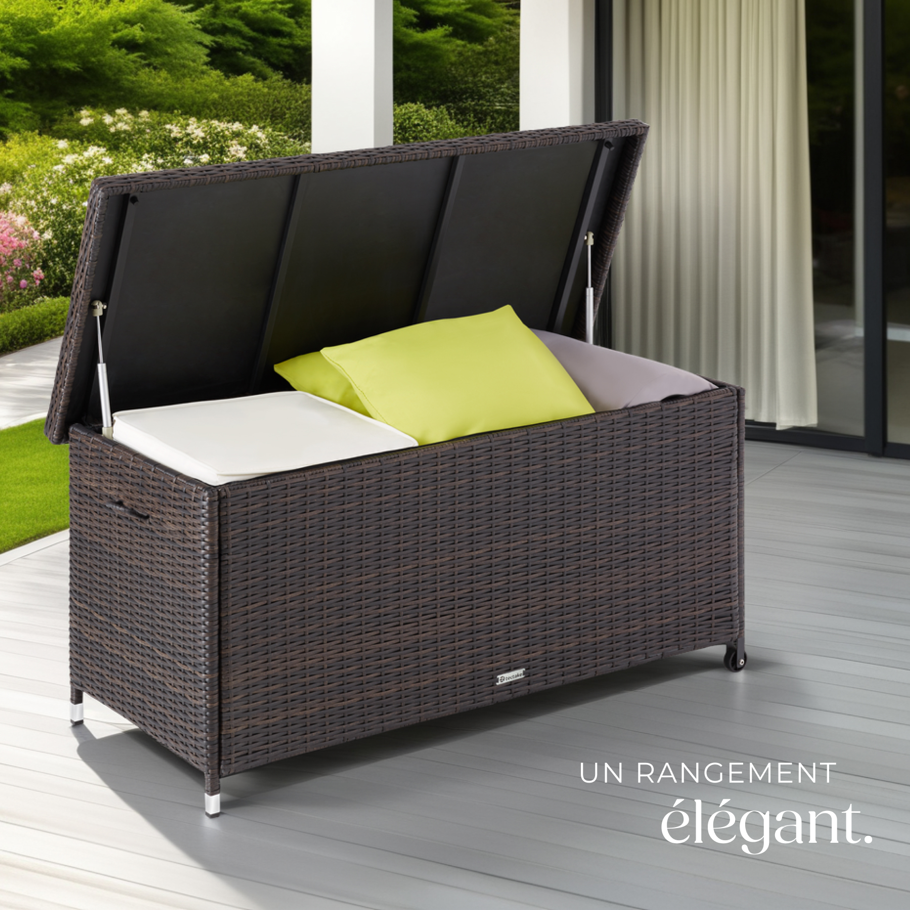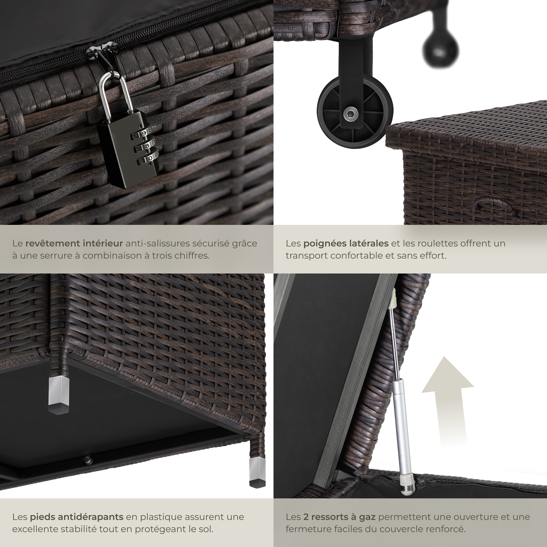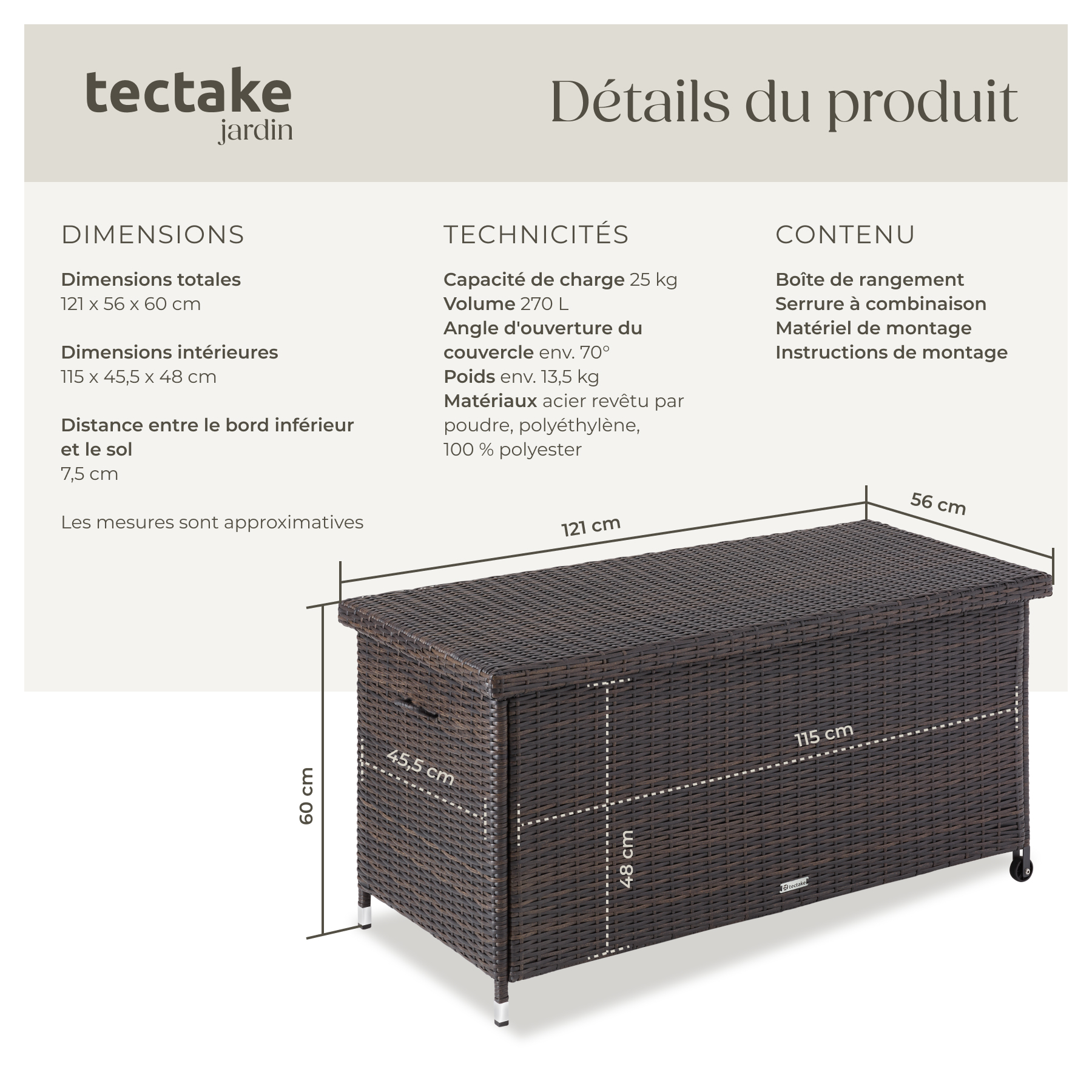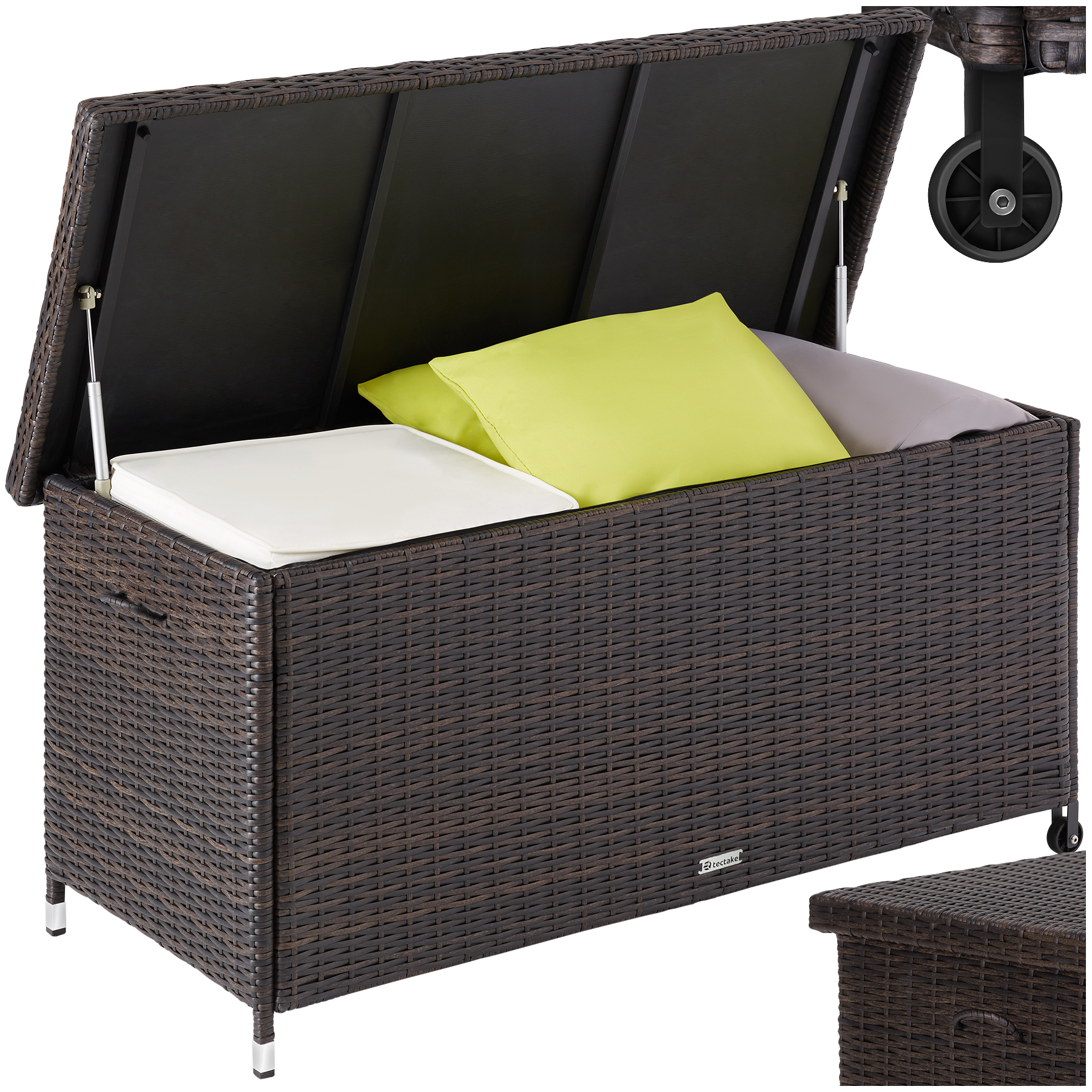 | Libellé | TECTAKE Coffre de jardin pour coussins 270 l, avec tressage en rotin marron |