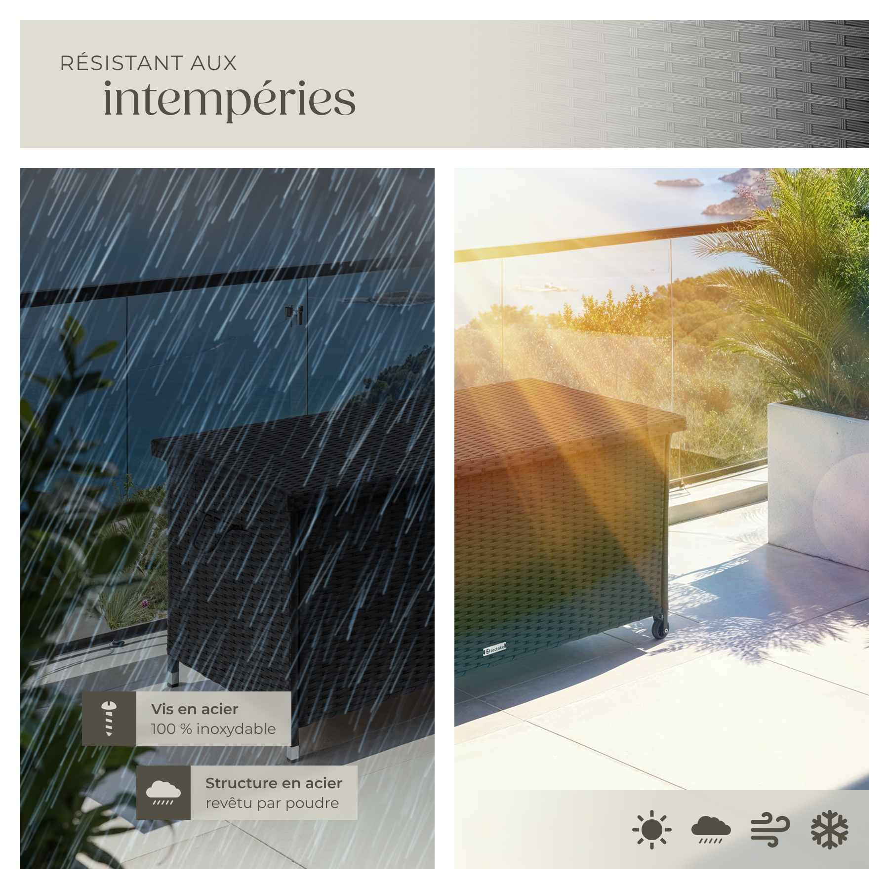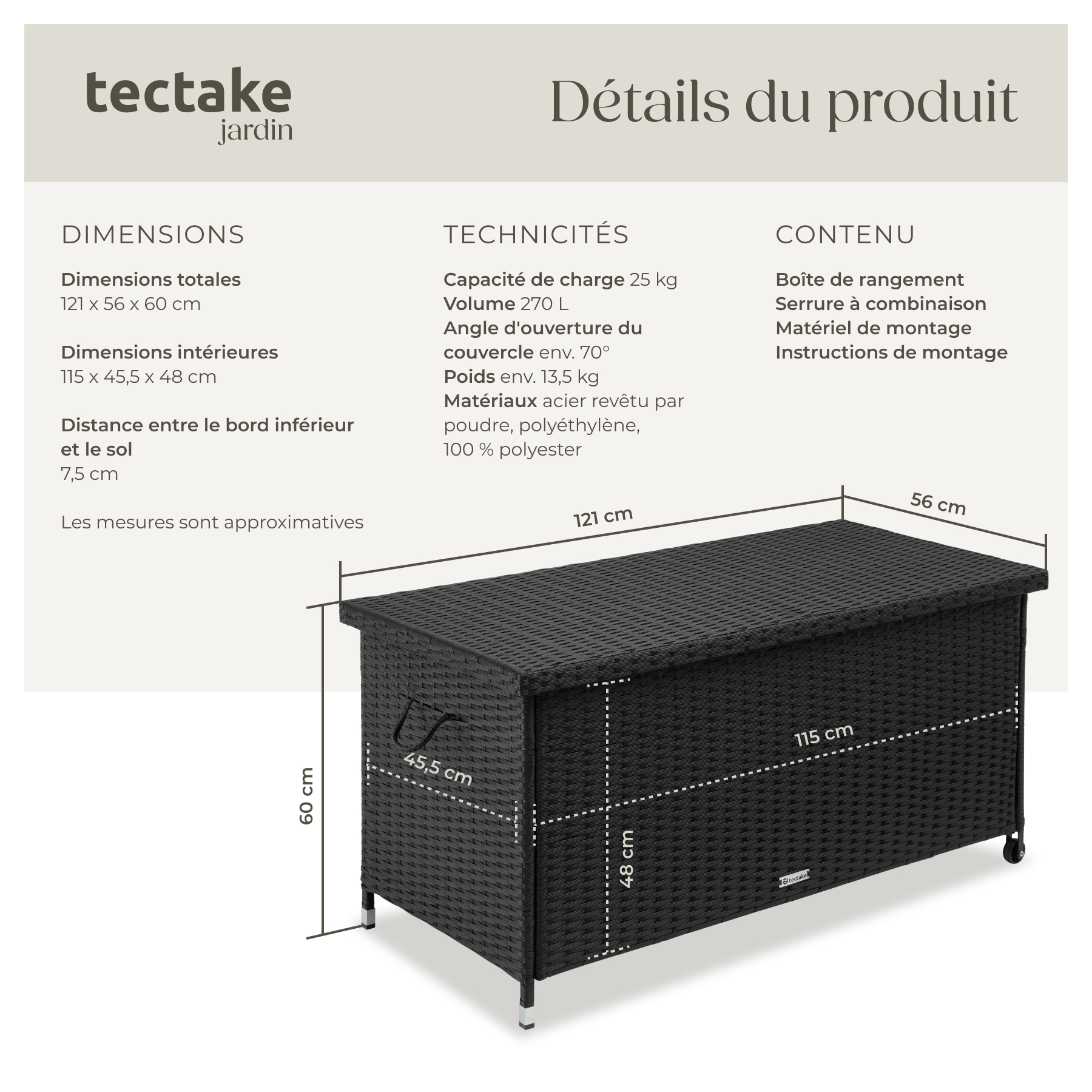 | Libellé | TECTAKE Coffre de jardin pour coussins 270 l, avec tressage en rotin noir |