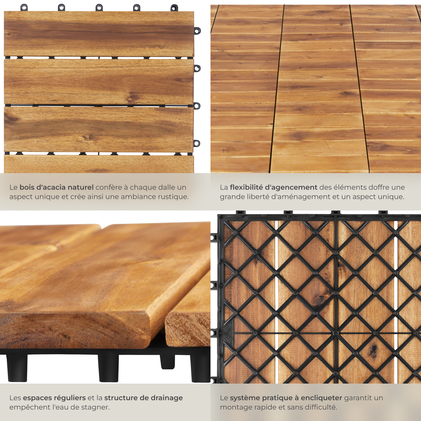 Optez pour la qualité et l'élégance avec les dalles de terrasse Tabula de tectake et transformez votre espace extérieur en une oasis de bien-être élégante. Ces dalles clipsables de haute qualité en bois d'acacia massif impressionnent par leur aspect naturel. Elles vous offrent une solution esthétique et durable pour votre projet de réaménagement.