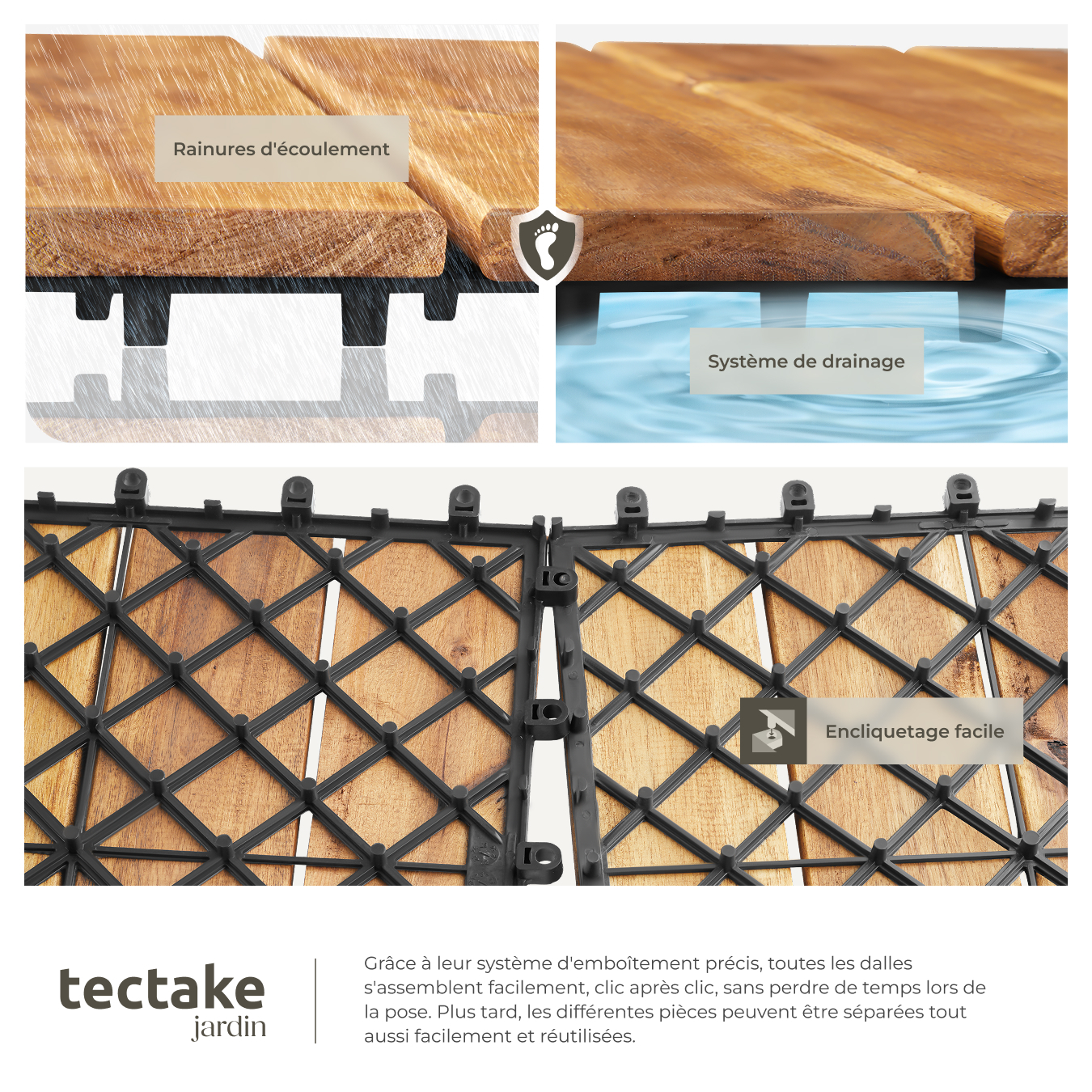 Le système de clips innovant permet un montage rapide et facile, de sorte que les dalles peuvent être posées sans grand effort et sans outils. La surface antidérapante assure une sensation de marche sûre et agréable, parfaite pour marcher pieds nus lors des chaudes journées d'été.